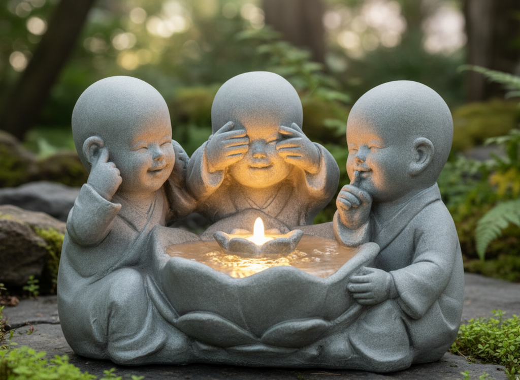 Ein Ort der Ruhe und Besinnung – der Gartenbrunnen Brunnen der Stille bringt mit seinen drei liebevoll gestalteten Mönchsfiguren nicht nur Wasser in Bewegung, sondern auch Geist und Seele zum Innehalten. Inspiriert vom Symbol der Weisheit „Nichts hören, nichts sehen, nichts sagen“ steht dieser Brunnen für Achtsamkeit und Harmonie. Das beruhigende Plätschern des Wassers wirkt meditativ und verwandelt Ihren Garten, Balkon oder Ihre Terrasse in eine kleine Wohlfühloase.