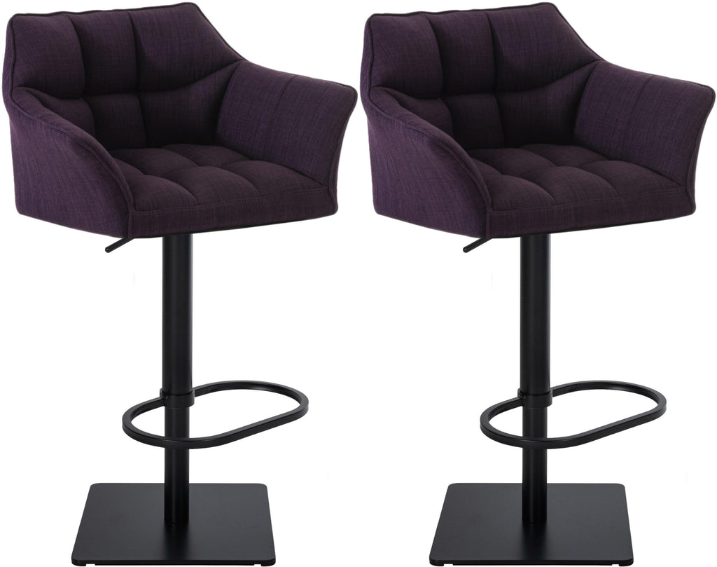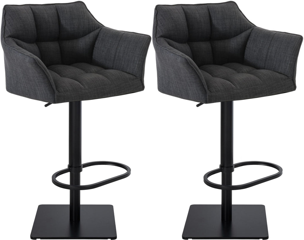 Details: Overall height: 88 - 113 cm Total width: 64 cm Total depth: 45 cm Seat height: 58 - 83 cm Seat surface (W x D): 40 x 36 cm Backrest height: 30 cm Armrest height: 15 cm Weight: 21 kg Maximum load capacity: 150 kg Included in delivery: 2 bar stools Material composition: 100% polyester