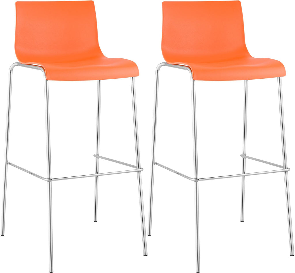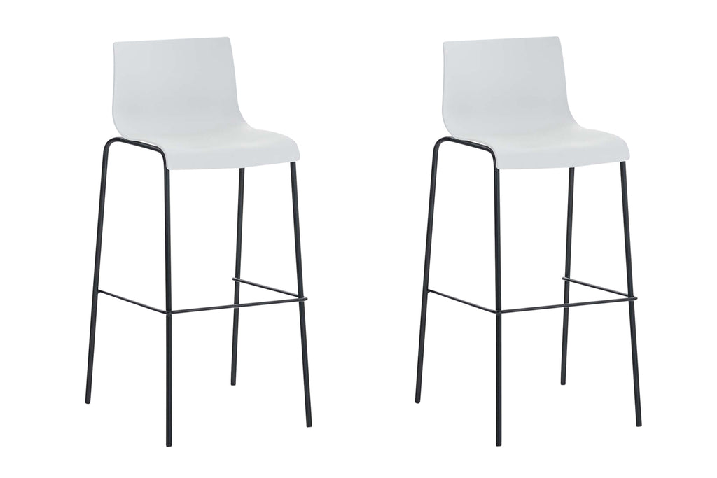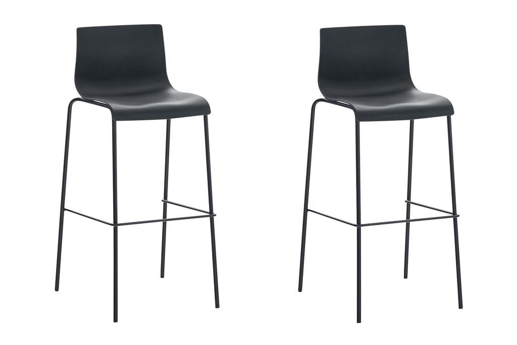Set of 2 Hover plastic bar stools This bar stool set impresses with its modern design and high seating comfort. The stable 4-leg metal frames ensure a safe and stable stand. The frames are available in black or chrome. The counter stools are stackable and can be stored to save space. The ergonomically shaped seats adapt to the body. The backrest, the seat and the footrest allow you to sit comfortably even for several hours. The plastic (polypropylene) seats and the metal frames are very easy to clean.