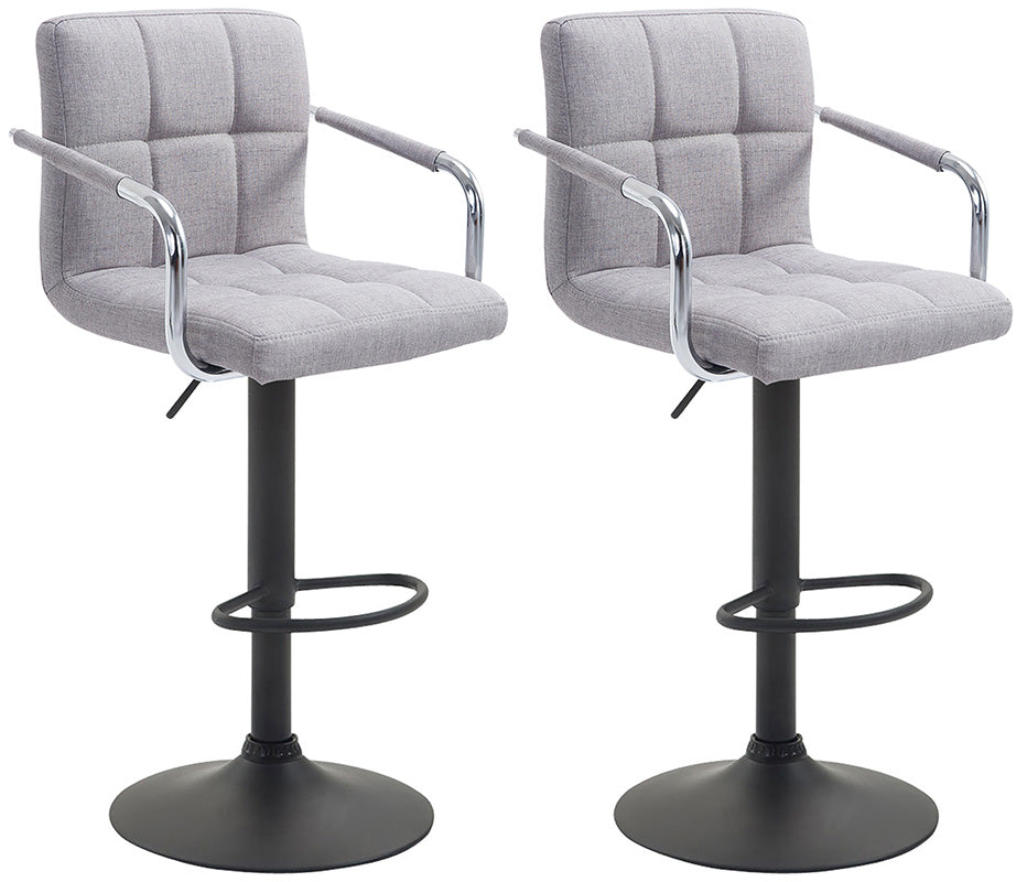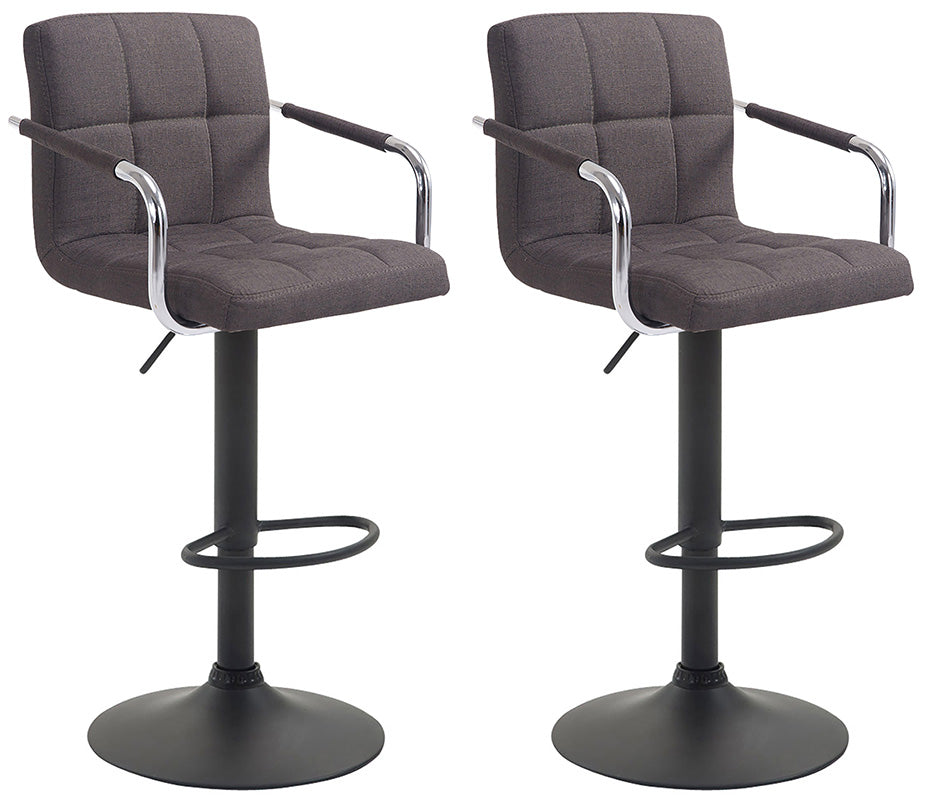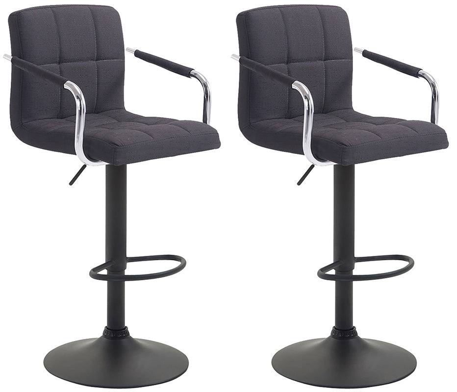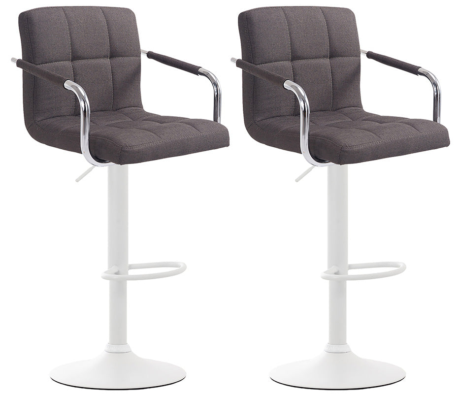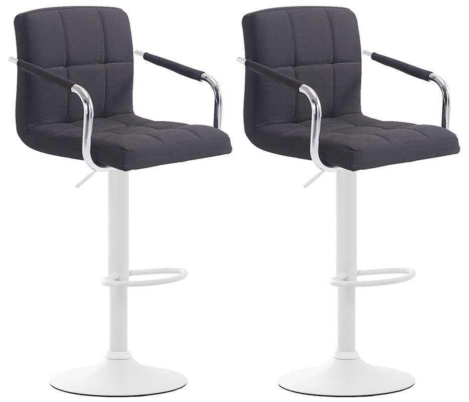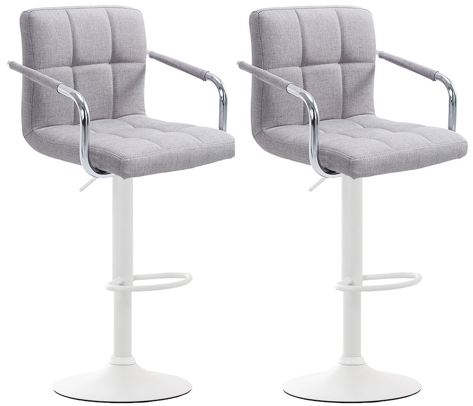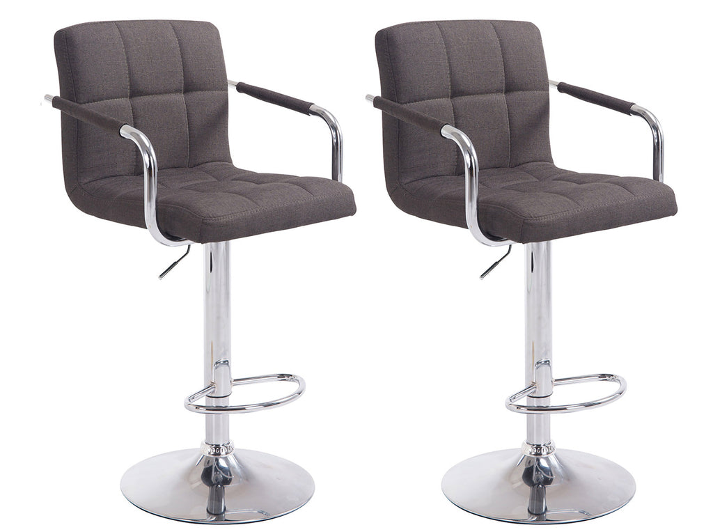 Set of 2 bar stools Lucy fabric With its timeless design, this modern bar stool set fits into any room. Its comfortable padding is complemented by modern backrests, armrests and ergonomic footrests. A nice detail is the stylish decorative stitching on the fabric-covered upholstery. Seats that can be rotated through 360° ensure comfort all around. They are also infinitely height-adjustable using a gas lift, making them ideal for any counter height.
