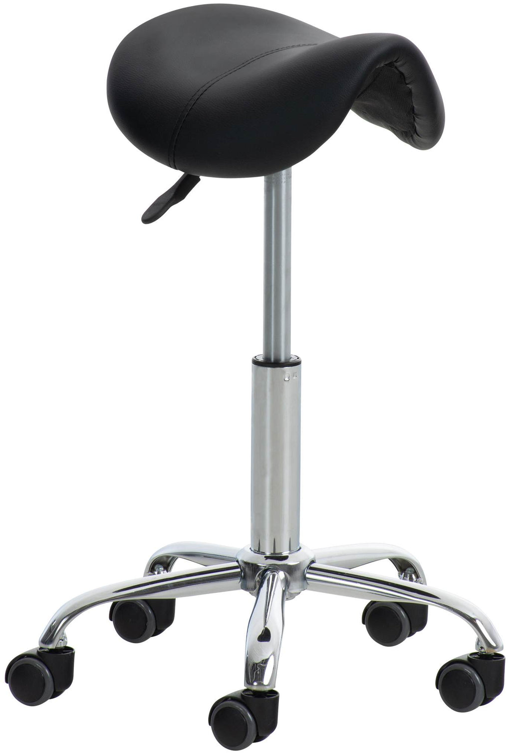 The Reno work stool is a comfortable seat that adds a fashionable touch to any room. It is ideal for doctor's offices, massage and beauty salons. Sitting comfortably on the rotating saddle seat with an individually adjustable seat height, you can roll around the room and work more flexibly. This rolling stool is also an asset at home as it is designed for everyday use. This swivel stool is equipped with an easy-care faux leather cover, which has decorative stitching. The sturdy frame is made of metal with a chrome look and stands on 5 smooth-running wheels with which you can always roll easily and loosely on hard floors or carpets. Simple, stylish design and robust materials that stand the test of time in everyday life - an all-round recommendable product.