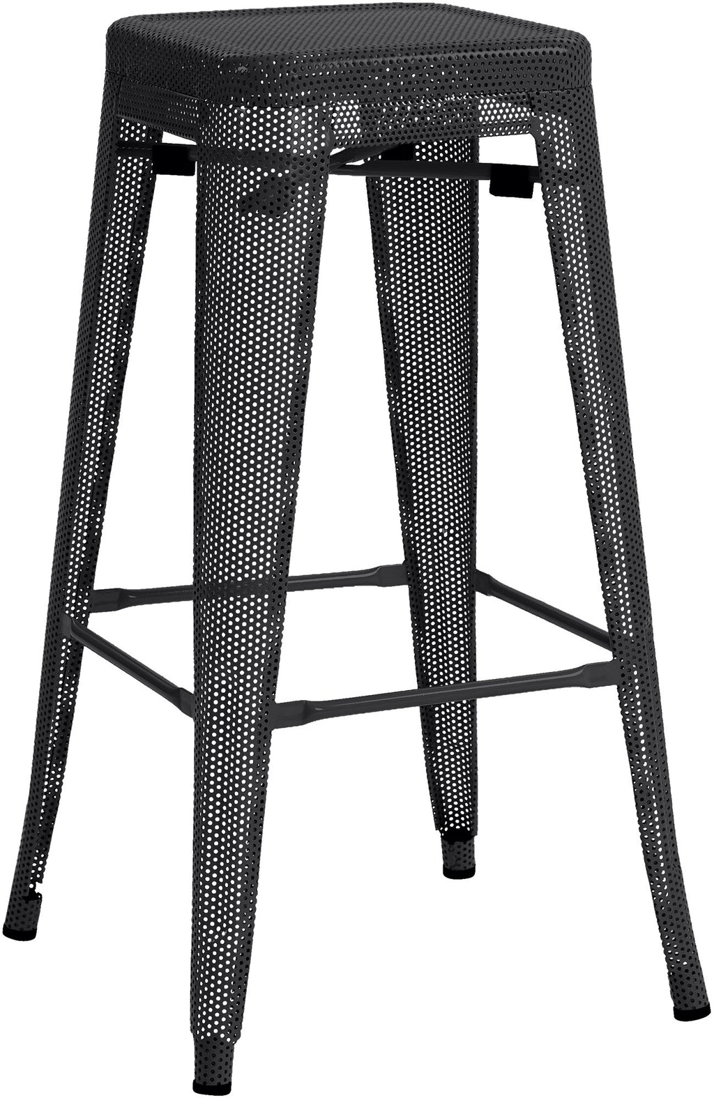 Equipped with a perforated metal frame, this stool combines visual lightness with stability and supports a load capacity of up to 120 kg. It also offers a footrest for improved seating comfort. It is stackable and is therefore particularly suitable for places with limited space. The seat height is 77 cm, which means it fits under every bar and high table. Floor protectors are included to protect floors from scratches and ensure stability. The material of the stool is easy to maintain, making it a practical piece of furniture for everyday use, both in the home and in the catering sector. Its industrial design fits into modern furnishing styles.