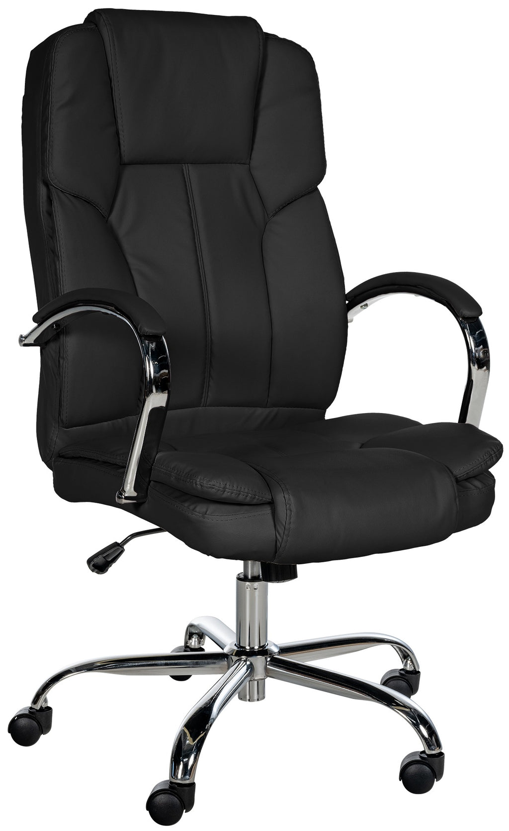 The BIG Xanthos office chair is designed for ergonomics and resilience, with a load capacity of up to 210 kg. Continuous height adjustment and a built-in rocker mechanism offer individual adjustment options. The padded armrests and backrests as well as the XXL seat width promote seating comfort. A metal frame with a chrome look and smooth-running castors guarantee stability and mobility on different surfaces. The faux leather cover is easy to care for and designed for long-term use.