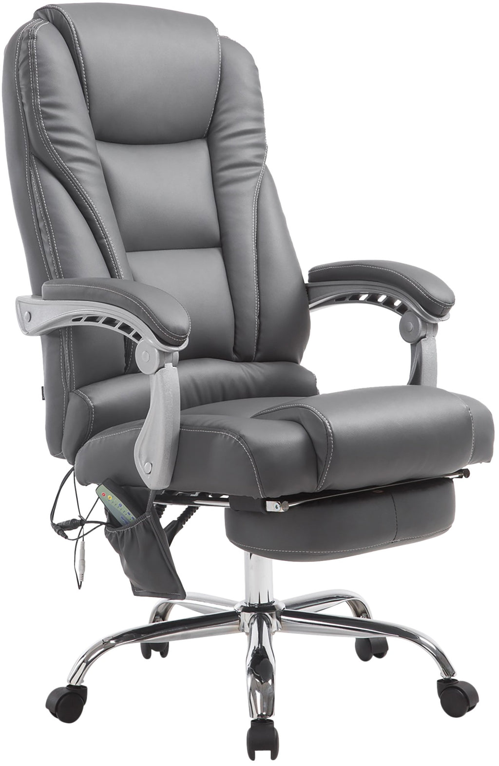 This office chair has a 7-point massage function controlled by a cable remote control. The chair can be rotated 360 degrees and is height adjustable, allowing for individual adjustment. The backrest reclines and the chair features thick padding for added comfort. A vibration function and a timer are also integrated. The chair is tiltable and can be fixed in different positions. A footrest is also available.