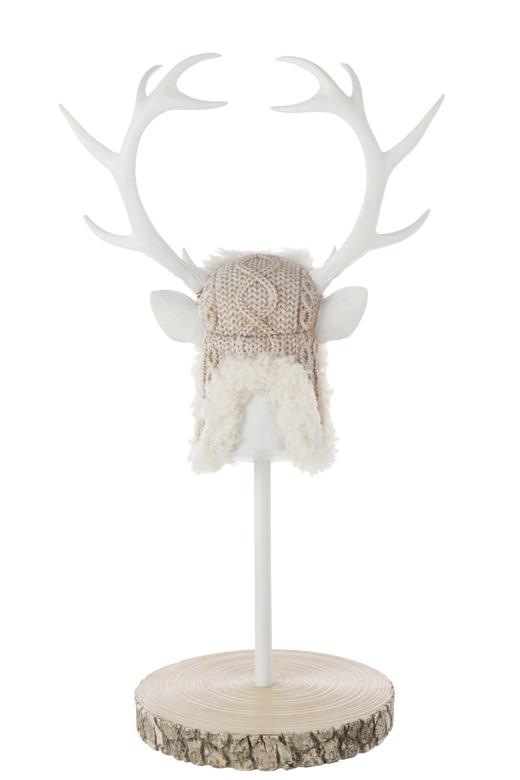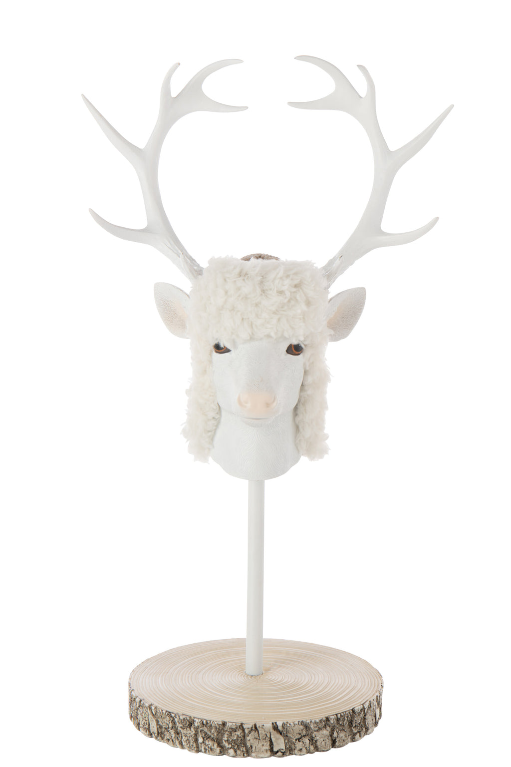 Die Dekofigur Hirsch Auf Fuß Pelz verbindet stilvolle Winteratmosphäre mit kunstvoller Gestaltung. Der detailreich modellierte Hirschkopf mit imposantem Geweih wirkt durch seine matte Ekru-Weiß-Farbgebung besonders modern und edel. Der flauschige Pelzbesatz verleiht der Figur eine warme und weiche Note, die sofort Gemütlichkeit ausstrahlt. Auf einem runden Sockel in natürlicher Holzoptik präsentiert, wird die Figur zu einem echten Blickfang auf Sideboards, Konsolen oder im Eingangsbereich. Diese hochwertige Polyresinfigur eignet sich ideal für winterliche und weihnachtliche Dekorationen sowie für stilvolle skandinavische Wohnkonzepte.