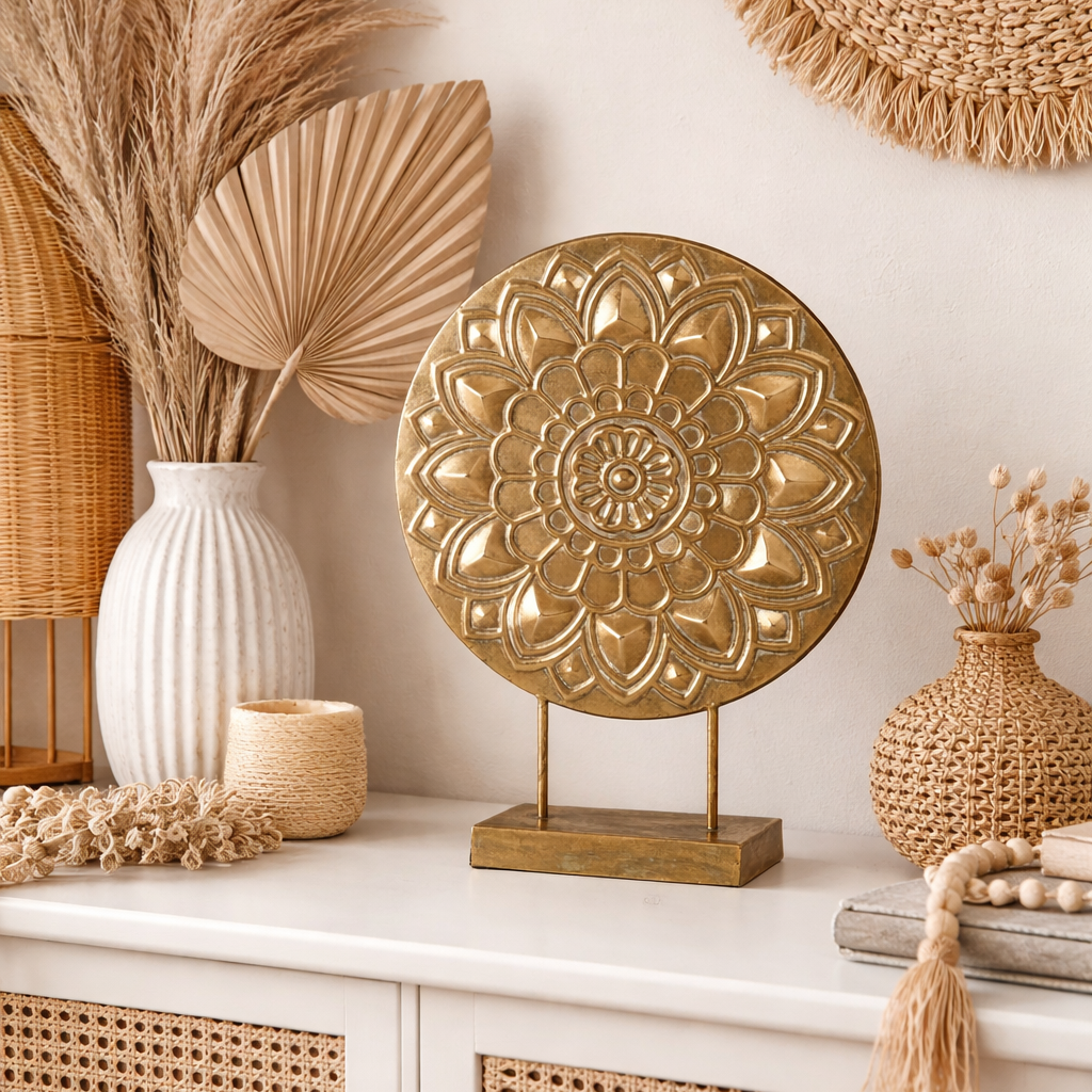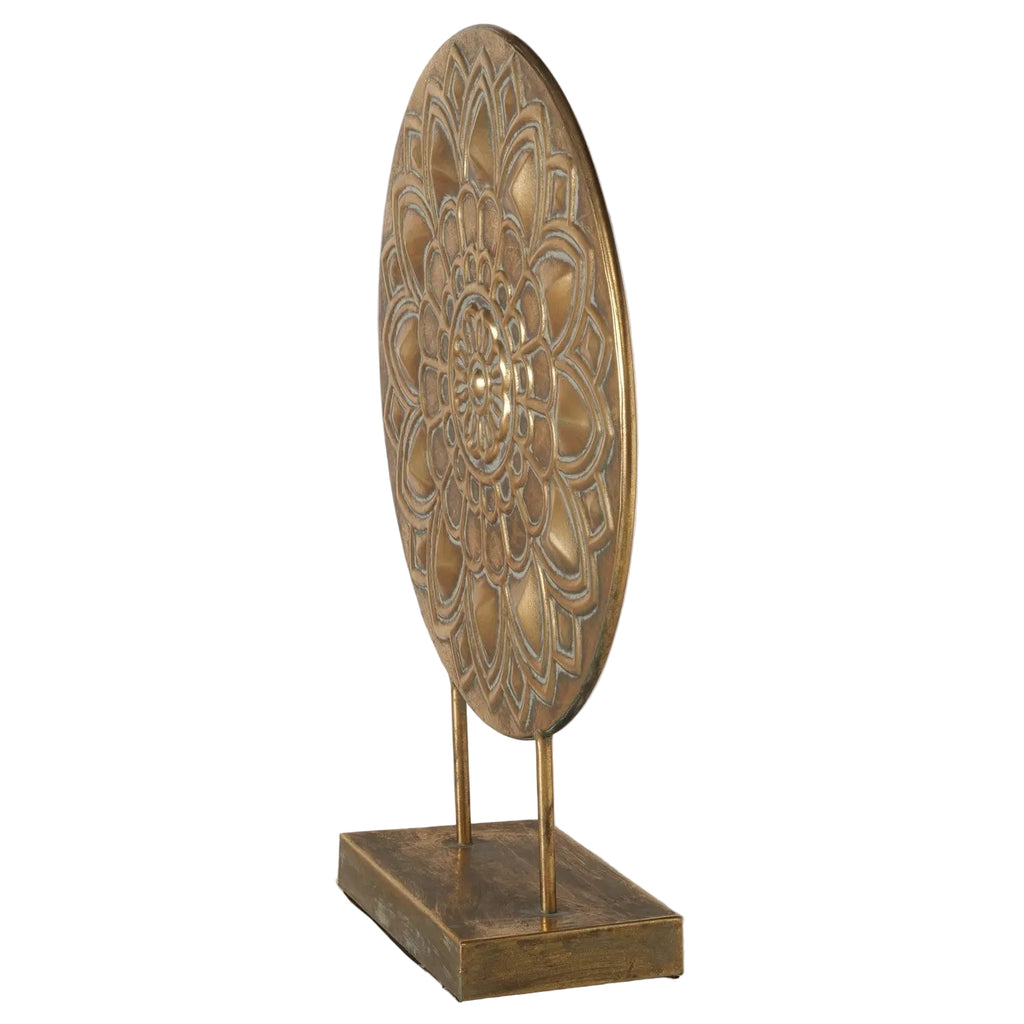 Der Dekoaufsteller Alhambra vereint kunstvolle Handarbeit mit hochwertigem Material und bringt einen Hauch orientalischer Eleganz in jeden Wohnraum. Die runde Form mit plastisch ausgearbeiteten, geometrischen Ornamenten erinnert an traditionelle Mandala-Muster und erzeugt eine harmonische, zeitlose Ausstrahlung. Durch das antikgoldfarbene Finish erhält das Dekorationsobjekt eine warme, edle Wirkung, die sich mühelos in moderne wie auch klassische Einrichtungsstile einfügt. Der massive Standfuß sorgt für stabilen Halt, während die matte Oberfläche den kunstvollen Charakter des Designs stilvoll unterstreicht.