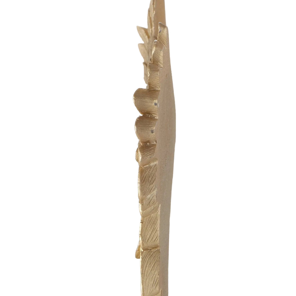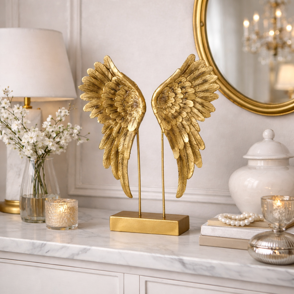 Der Dekoaufsteller Auria Goldflügel vereint elegante Symbolkraft mit kunstvoller Handarbeit. Die filigran ausgearbeiteten Engelsflügel präsentieren sich in einer harmonischen, geschwungenen Silhouette, die jedem Raum eine sanfte, hochwertige Ausstrahlung verleiht. Das goldene Metallic-Finish, sorgfältig von Hand bemalt, betont die feinen Strukturen jeder einzelnen Feder und schafft ein beeindruckendes Spiel aus Licht und Reflexion. Gefertigt aus robustem Kunstharz, steht die Skulptur sicher auf ihrem massiven Standfuß und eignet sich perfekt als stilvolles Highlight für Wohnräume, Flure oder dekorative Inszenierungen im modernen wie klassischen Ambiente.