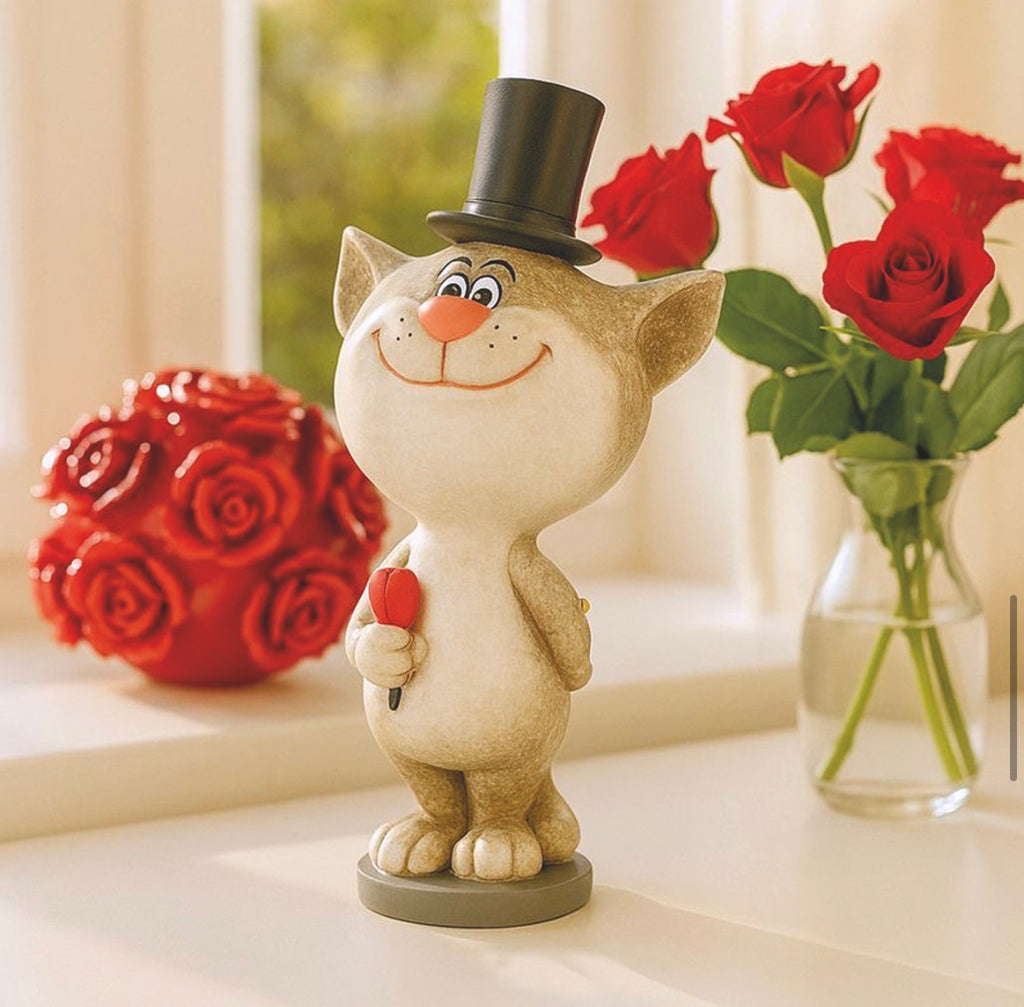 The GentleCat decorative figurine is a true charmer with style. With an elegant top hat on its head and a red rose in its paw, this enchanting cat figurine embodies the classic gentleman motif in a particularly loving and humorous way. The glossy surface and subtle gray with black accents make GentleCat a stylish decoration idea for any home. Whether as a romantic gift idea or as a charming eye-catcher on the sideboard – GentleCat is guaranteed to bring a smile.