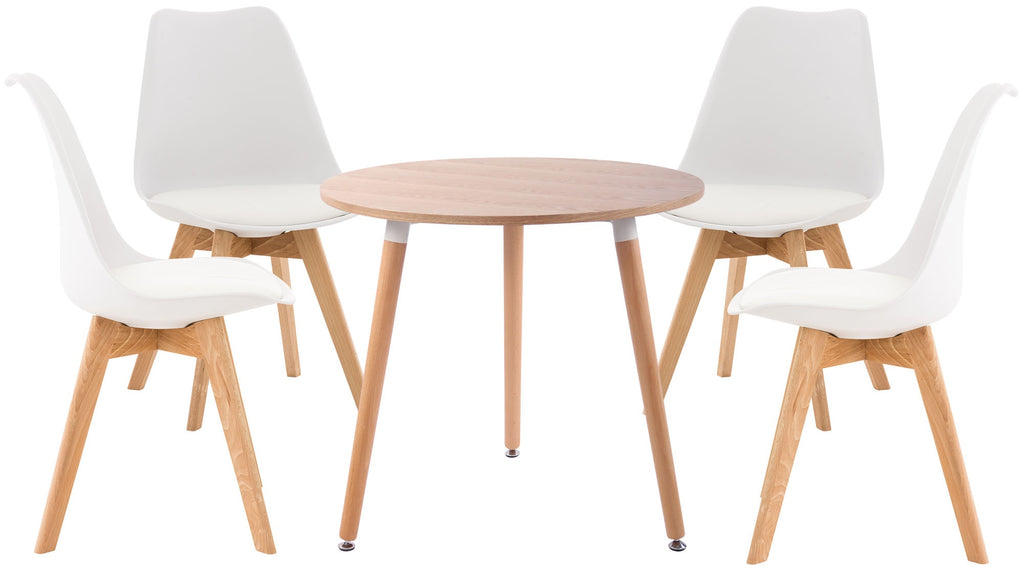 The round MDF tabletop of the Ansgar table rests on beechwood legs. The seat shells of the four Linares chairs are made of sturdy plastic and feature a backrest that relieves pressure on the back. The seat cushion, covered in easy-care faux leather, provides additional comfort.