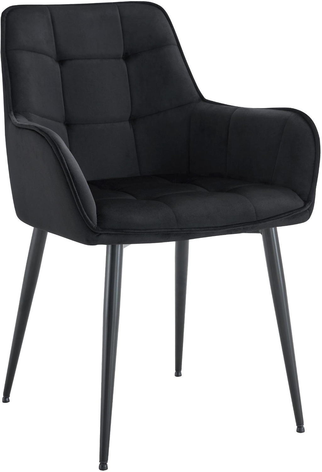 Ferndale dining chair This dining room chair combines modern design with comfortable functionality. The padded seat and armrests provide comfortable support. The easy-care velvet cover ensures a stylish look, while the sturdy metal frame with floor protectors protects the floor from scratches and prevents slipping. With a load capacity of up to 150 kg and an ergonomic shape, the chair is ideal for sitting for long periods. The armchair is available in various colors. This chair fits harmoniously into different interior styles - perfect for the dining room, bedroom or as a reading chair.