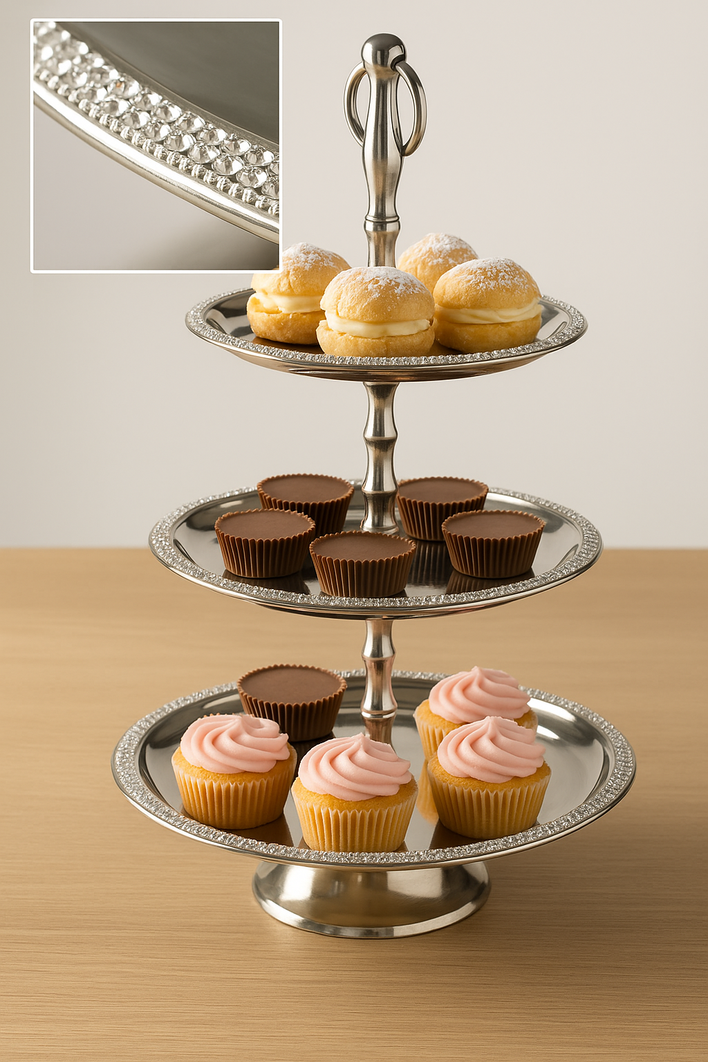 The Brilli tiered stand is a stylish highlight for any festive table and an elegant eye-catcher in your home. With three levels, it offers ample space for chocolates, pastries, or small snacks – always served with a touch of glamour. The round shelves are lovingly decorated with sparkling crystal stones that create a dreamy sparkle depending on the light. The high-quality craftsmanship and the nickel-plated, polished stainless steel finish give this gem a luxurious aura. A particularly sophisticated feature: the elegant carrying handle makes the tiered stand not only practical but also a decorative object.