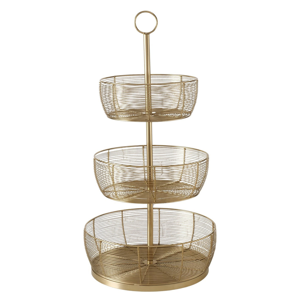 Die Enrico Etagere präsentiert sich als hochwertiges Wohnaccessoire aus fein gearbeitetem Eisen. Mit einer Höhe von 70 cm und einem Durchmesser von 36 cm bietet sie drei harmonisch übereinander angeordnete Körbe, die durch ihre klare Form und die elegante goldfarbene Lackierung eine moderne und zugleich edle Optik erhalten.