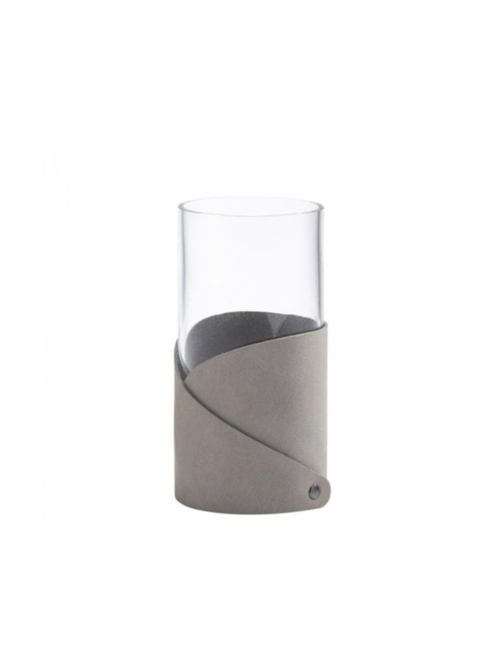 Puristische Vase in Zylinderform aus dickem Glas, mit einer gewickelten Lederummantelung gearbeitet. Die Glasvase kann auch ohne Lederhülle genutzt und gereinigt werden.