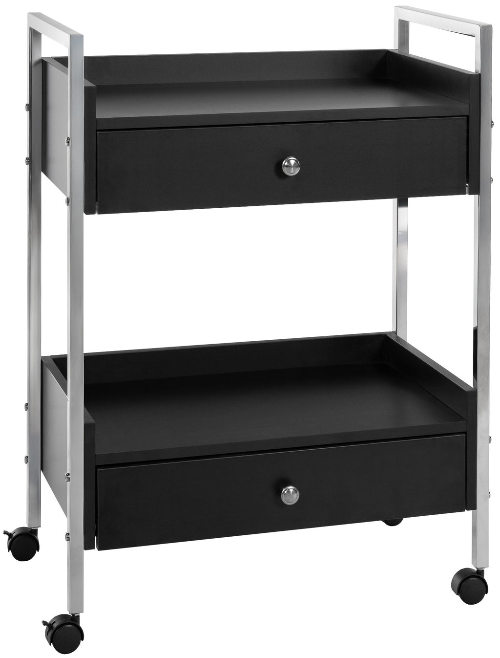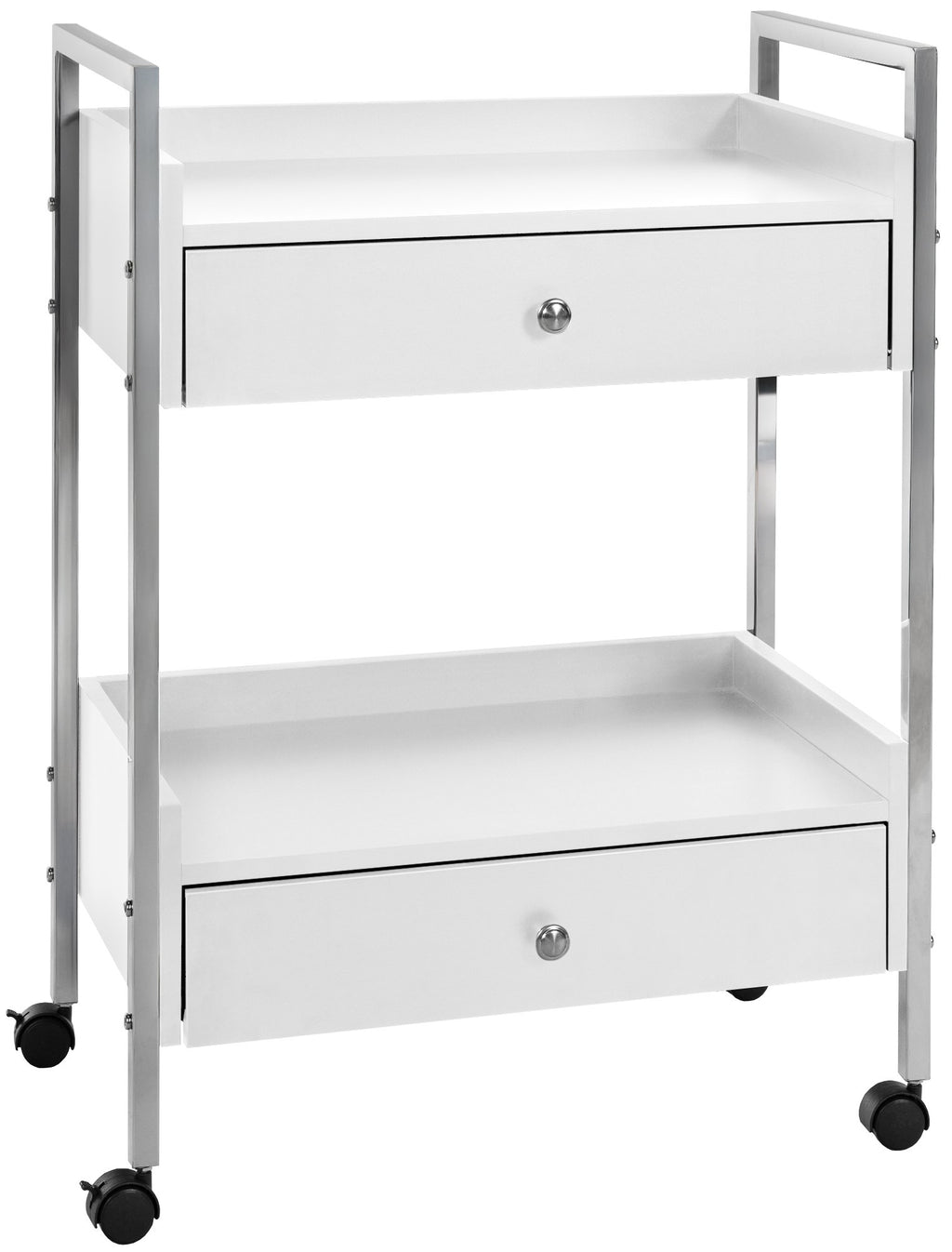 Mit zwei geräumigen Schubladen und zwei darüberliegenden Ablageflächen bietet der kompakte Allzweckwagen viel Platz für Arbeitsutensilien und Kosmetikprodukte. Die Schubladen sind mit einer Soft-Close-Funktion ausgestattet, sodass sie sanft schließt.