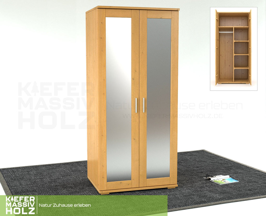 Nobis Spiegeltürenschrank | Kleiderschrank | Regale und Kleiderstange | 100% Bio Kiefer Massivholz