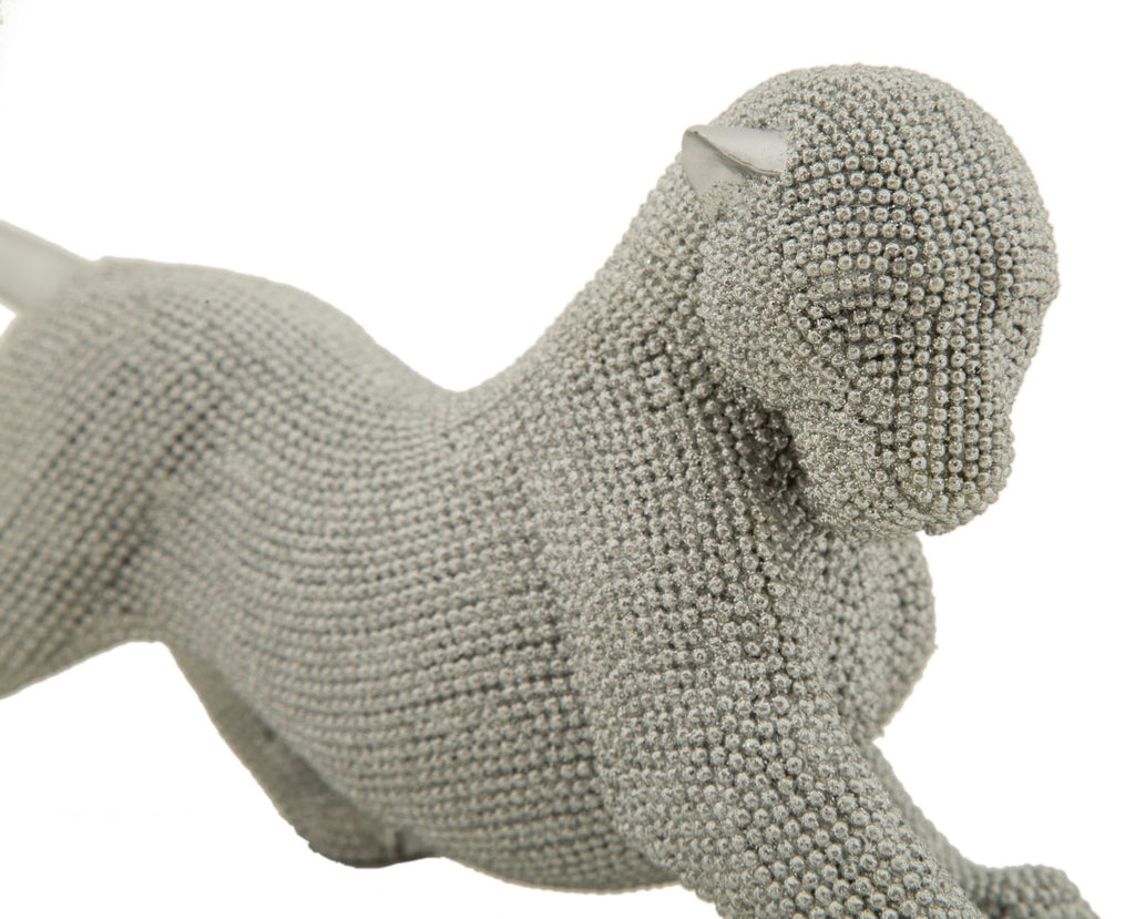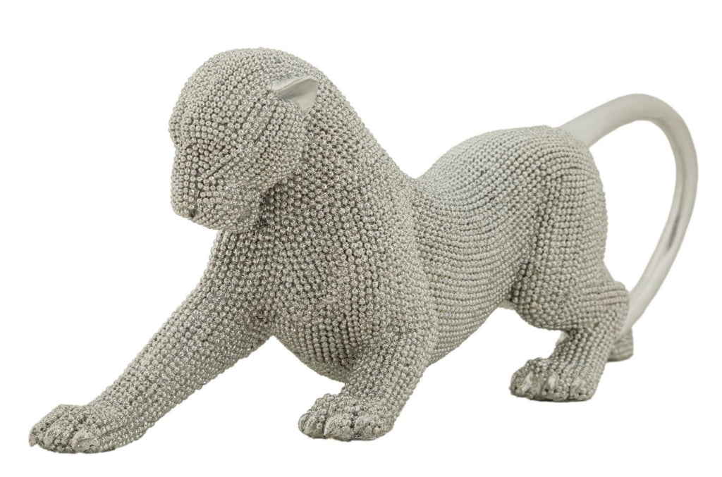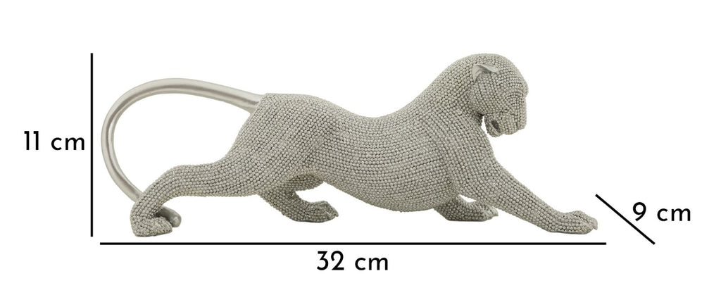 Silvera Glam ist mehr als nur eine Dekofigur – sie ist ein Statement. Mit ihrer anmutigen Silhouette, dem detailreich strukturierten Oberflächenfinish und dem kühlen Silberton vereint diese Pantherfigur moderne Eleganz mit purer Ausdruckskraft. Die Oberfläche aus hunderten kleinen glänzenden Kugeln verleiht ihr eine luxuriöse Wirkung, die besonders in glamourösen Wohnkonzepten voll zur Geltung kommt. Ein wahres Highlight auf Sideboard, Konsole oder in offenen Regalen.