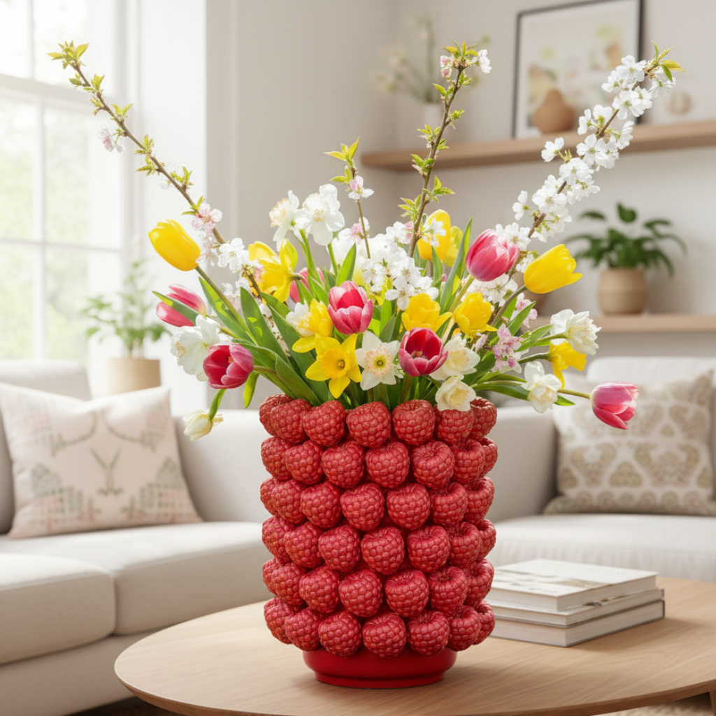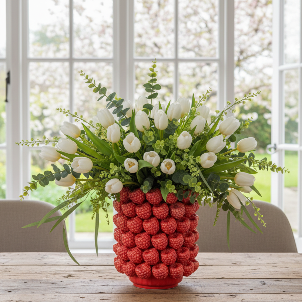Die Rubenia Himbeer Vase überzeugt mit einem außergewöhnlichen Design und wird zum besonderen Blickfang in jedem Wohnraum. Die Oberfläche der Vase ist vollständig mit plastisch ausgearbeiteten Himbeeren gestaltet, wodurch eine lebendige Struktur und eine besondere Tiefenwirkung entsteht. Die intensive rote Farbgebung in Kombination mit der glänzenden Oberfläche verleiht der Vase eine moderne und zugleich verspielte Ausstrahlung.