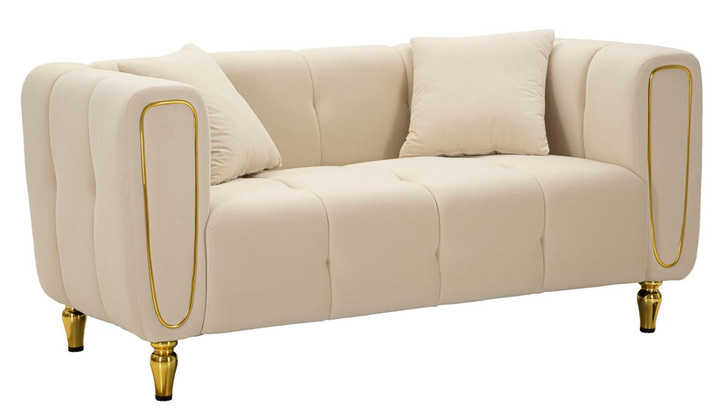 Samt Sofa Alma Crema 155 cm mit Kissen und Goldfüßen