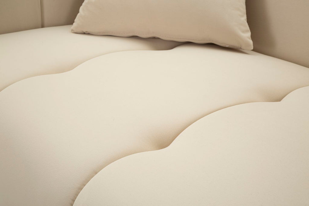 Alma Crema verbindet moderne Formen mit klassischer Eleganz. Der samtweiche Bezug in zartem Cremeton harmoniert perfekt mit den goldfarbenen Akzenten an Füßen und Armlehnen. Die weiche Polsterung mit dezenten Steppnähten sorgt für stilvollen Komfort, während zwei passende Kissen das Gesamtbild abrunden. Dieses Sofa ist ein Highlight für stilvolle Interiors – elegant, weich und doch ein klares Statement.