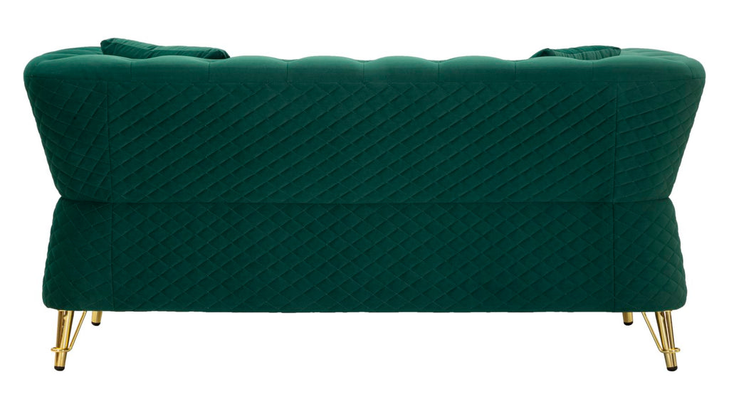 Aurelia Verde ist ein Sofa für alle, die Stil, Komfort und Glamour lieben. In tiefem Smaragdgrün bezogenem Samtstoff und mit auffälligen goldfarbenen Metallakzenten an Beinen und Armlehnen bringt dieses Sofa mondänen Luxus in dein Zuhause. Die gepolsterten Rückenlehnen mit Chesterfield-Steppung, die elegante Rautensteppung außen und die beiden passenden Kissen sorgen für höchsten Komfort und ein absolut harmonisches Design. Ein Highlight für Wohnräume mit Charakter.