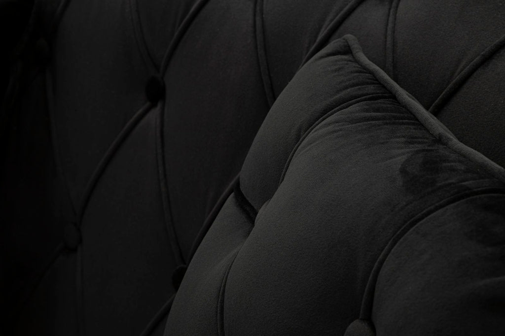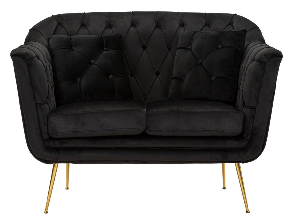 Noir Bellezza ist ein stilvolles 2-Sitzer-Sofa, das Eleganz und Glamour vereint. Der tiefschwarze Samtbezug mit Rautensteppung und Knopfdetails sorgt für eine edle Optik, während die filigranen goldfarbenen Füße dem Design Leichtigkeit und Klasse verleihen. Zwei dazu passende Kissen unterstreichen den hochwertigen Look und bieten zusätzlichen Komfort. Ein Sofa für alle, die modernes Wohnen mit einem Hauch Luxus lieben.