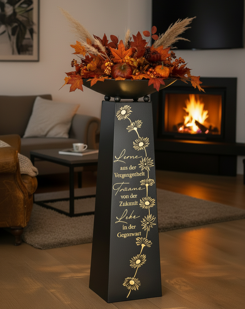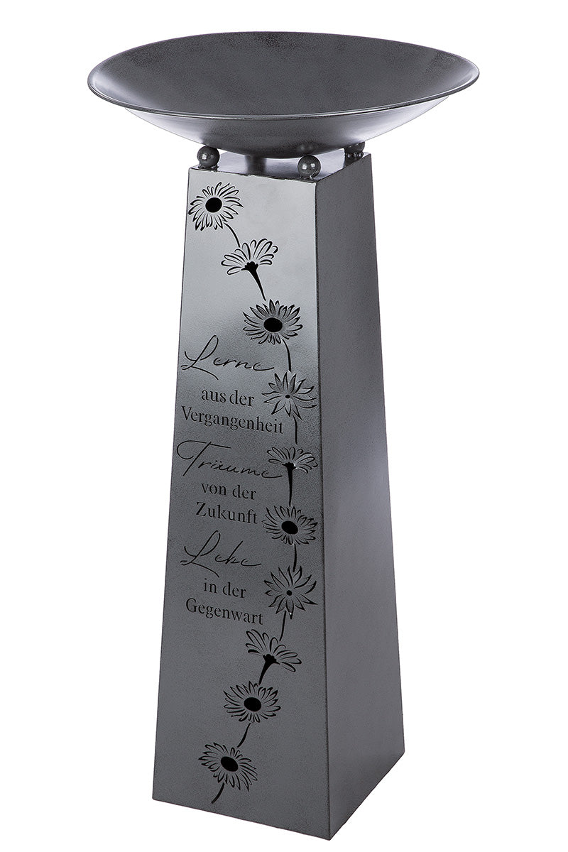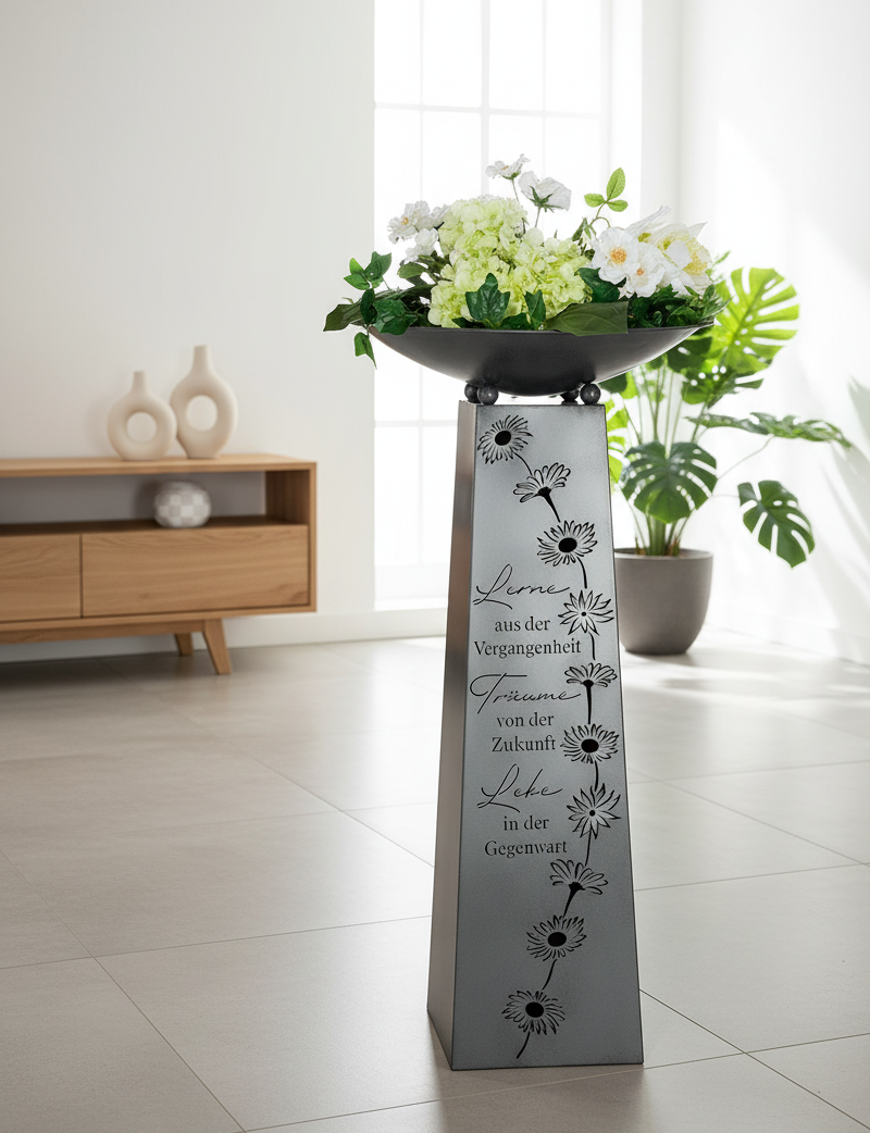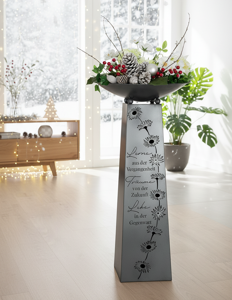 Der Schalenständer Lerne Träume Lebe ist ein stilvolles Dekoobjekt, das durch sein harmonisches Zusammenspiel aus Metall, Blumenmotiv und inspirierendem Spruch überzeugt. Die graue Antikfinish Oberfläche verleiht dem Ständer eine elegante und zugleich zeitlose Ausstrahlung. Ob für Blumenarrangements, dekorative Schalen oder saisonale Gestaltung – dieses Stück setzt jedes Arrangement formschön in Szene. Mit einer Höhe von 102 cm bietet der Ständer eine optimale Präsentationsfläche und fügt sich sowohl in moderne als auch klassische Wohnräume ein. Ein hochwertiges Wohnaccessoire, das zugleich dekorativ und inspirierend wirkt.