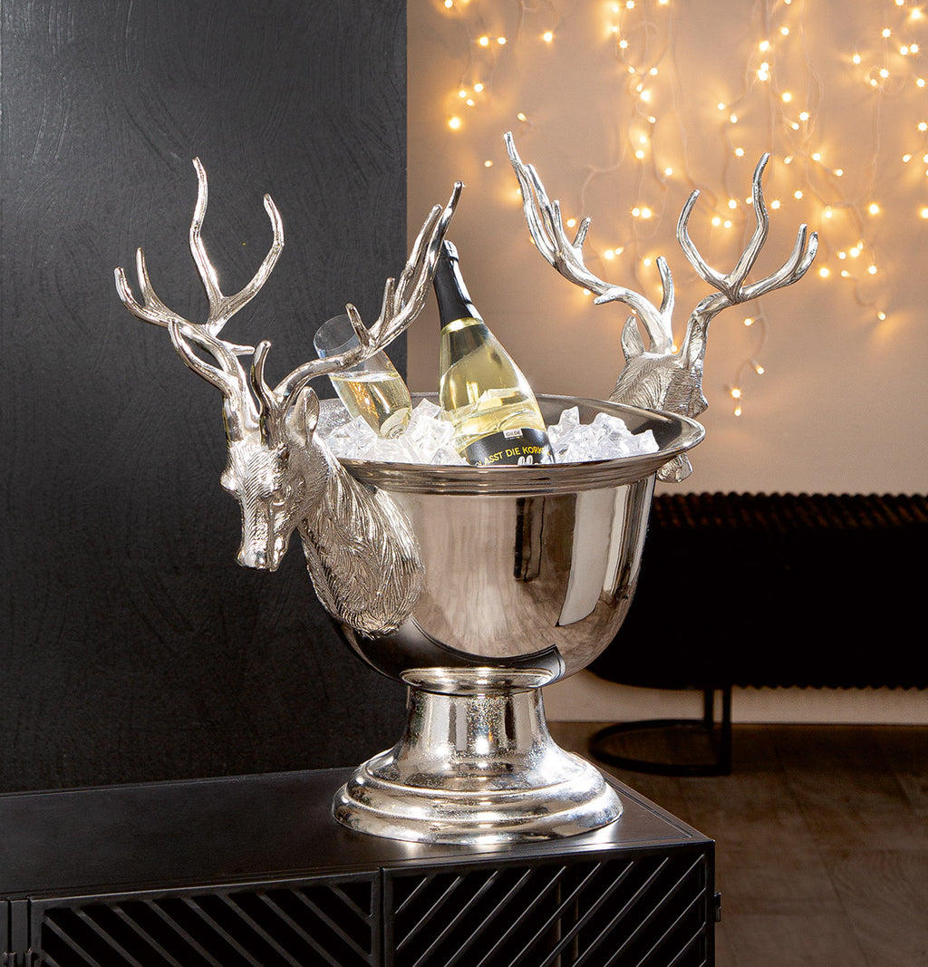 Ein Hauch von Eleganz für Ihre Festtafel: Der Sekt- Weinkühler William ist nicht nur funktional, sondern auch ein echtes Deko-Statement. Mit seiner opulenten Erscheinung und den eindrucksvollen Hirschköpfen als Griffe zieht er garantiert alle Blicke auf sich. Die hochwertige Verarbeitung aus glänzendem Aluminium verleiht dem Kühler eine edle Ausstrahlung, während das silberfarbene Finish für eine stilvolle Note sorgt. Ob zu Weihnachten, bei festlichen Dinnerpartys oder als Highlight auf dem Sideboard – William vereint dekorative Raffinesse mit praktischem Nutzen. In ihm finden gleich mehrere Flaschen Platz und bleiben dank Eis stilvoll gekühlt. Dieser luxuriöse Weinkühler bringt festliche Stimmung und Glanz in jedes Zuhause.