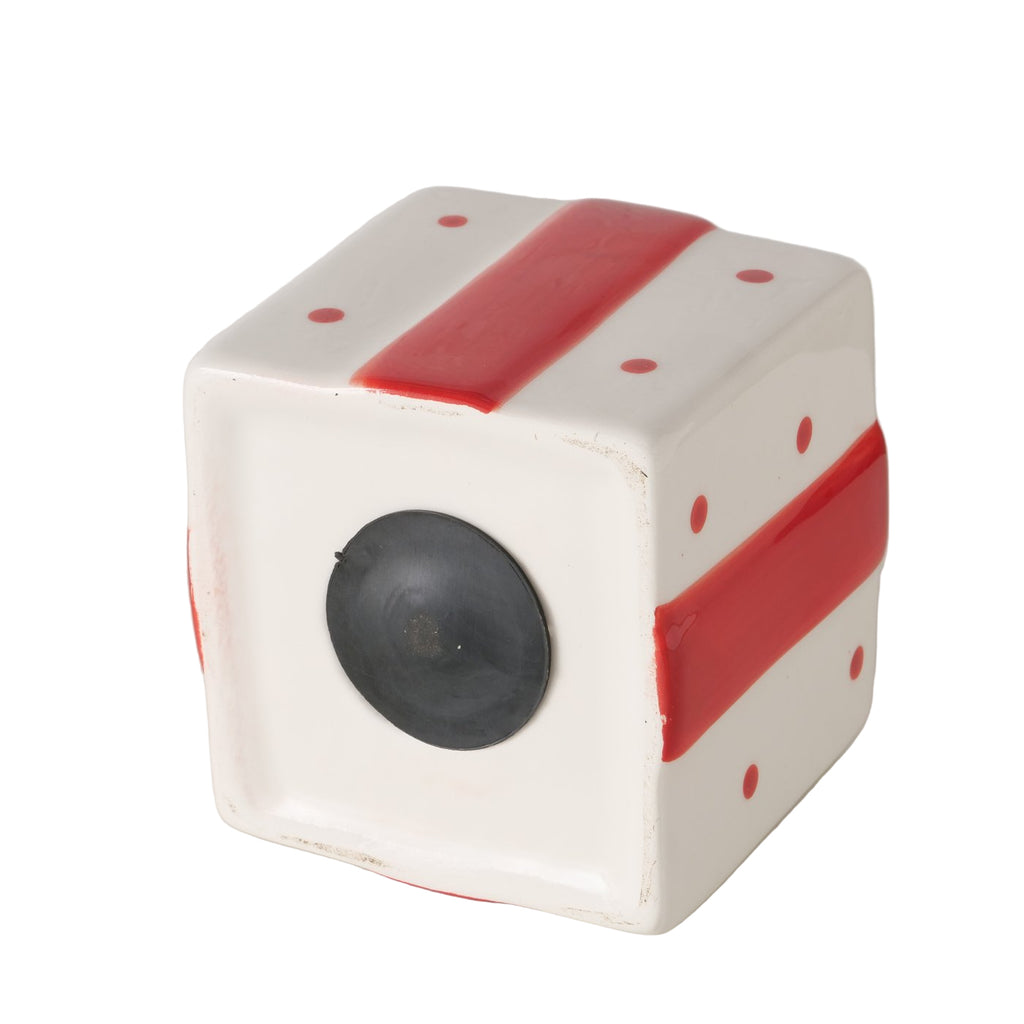 Die liebevoll gestaltete Spardose Gift ist nicht nur ein praktischer Helfer beim Sparen, sondern auch ein echter Hingucker. In Form eines festlich verpackten Geschenks mit roter Schleife und Punkten auf glänzend weißem Grund zieht sie alle Blicke auf sich – ob auf dem Schreibtisch, im Kinderzimmer oder als originelle Geschenkidee zu besonderen Anlässen. Die hochwertige Verarbeitung aus lasierter Keramik und handbemalten Details macht jede Spardose zu einem kleinen Unikat. Der praktische Gummiverschluss an der Unterseite ermöglicht ein einfaches Entleeren – ganz ohne zu zerbrechen.