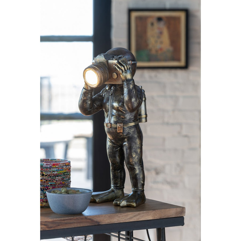 Die außergewöhnliche Tischlampe Diver ist ein echtes Highlight für Liebhaber besonderer Wohnaccessoires. Gefertigt aus hochwertigem Polyresin, zeigt sie eine stilisierte Taucherfigur im Retro-Look, die eine Kamera mit integriertem Leuchtkörper hält. Die antik-goldene Farbgebung verleiht der Lampe einen edlen, leicht industriellen Charakter, der perfekt zu modernen, urbanen oder Vintage-Einrichtungen passt. Ob auf einem Beistelltisch, im Regal oder auf dem Schreibtisch – diese Lampe sorgt garantiert für neugierige Blicke und ein warmes, gemütliches Lichtambiente.