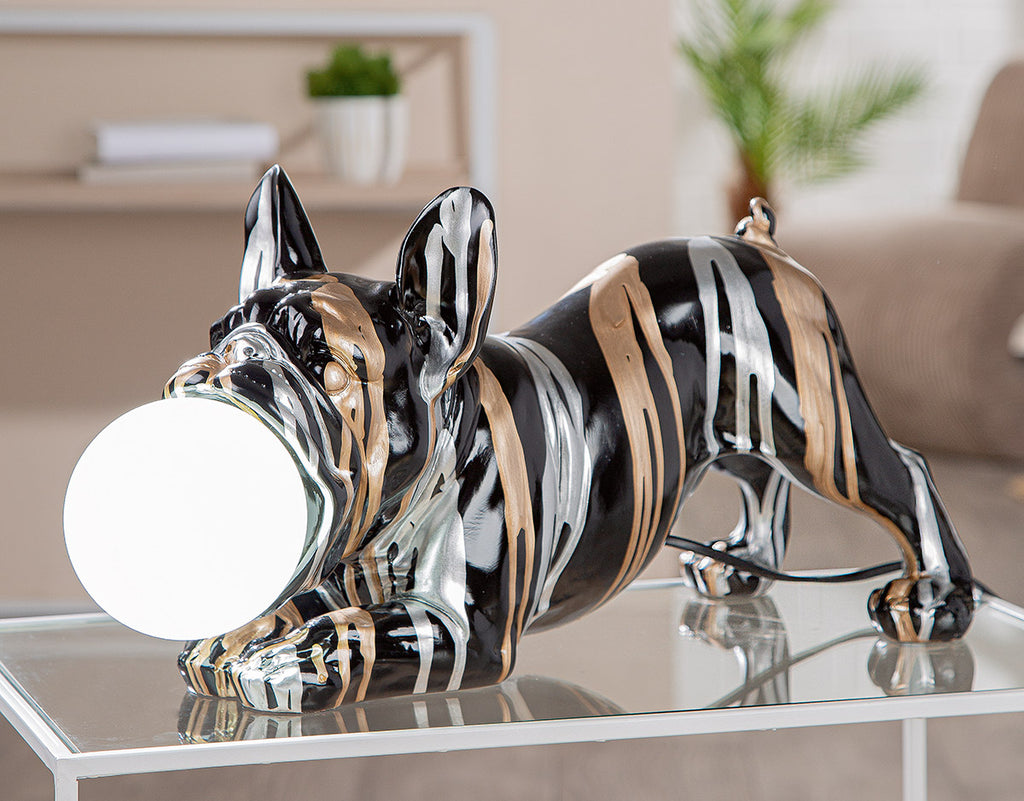 Die Tischleuchte Bulldog Drip verbindet stilvolle Beleuchtung mit dekorativem Charme. Gefertigt aus hochwertigem Kunstharz und veredelt mit einer metallischen Optik, präsentiert sich die Leuchte in einem ausdrucksstarken Bulldoggen-Design, das jeden Blick auf sich zieht. Die schwarz-silberfarbene Oberfläche verleiht dem Stück einen edlen, modernen Charakter, der sich harmonisch in verschiedenste Einrichtungsstile einfügt. Mit ihrem einzigartigen Ballmotiv und der integrierten G9-Fassung sorgt die Lampe nicht nur für angenehmes Licht, sondern auch für ein dekoratives Highlight auf Sideboards, Kommoden oder Beistelltischen.