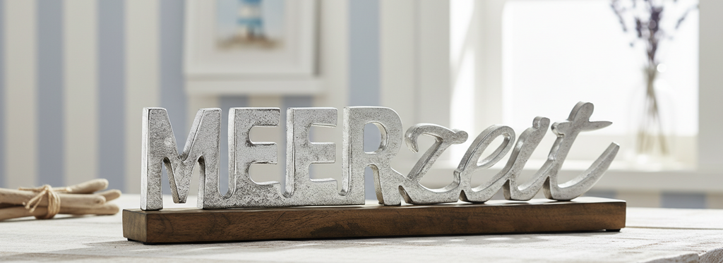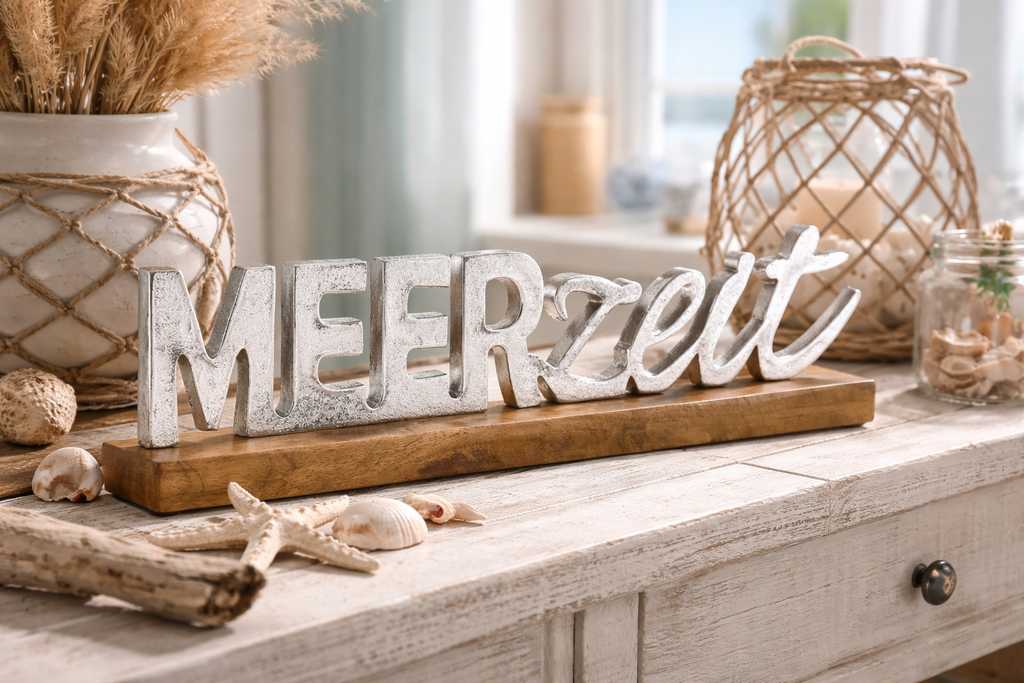 Die strukturierte Oberfläche des Aluminiums sorgt für eine lebendige Optik und unterstreicht den hochwertigen Charakter dieses Wohnaccessoires. Der warme Holzton des Sockels bildet einen natürlichen Kontrast zum kühlen Metall und passt perfekt in ein maritim inspiriertes Ambiente mit Muscheln, Treibholz, Leinenstoffen und sanften Blau und Naturtönen. Besonders in hellen Wohnräumen oder im strandnah gestalteten Zuhause kommt dieser Schriftzug eindrucksvoll zur Geltung.