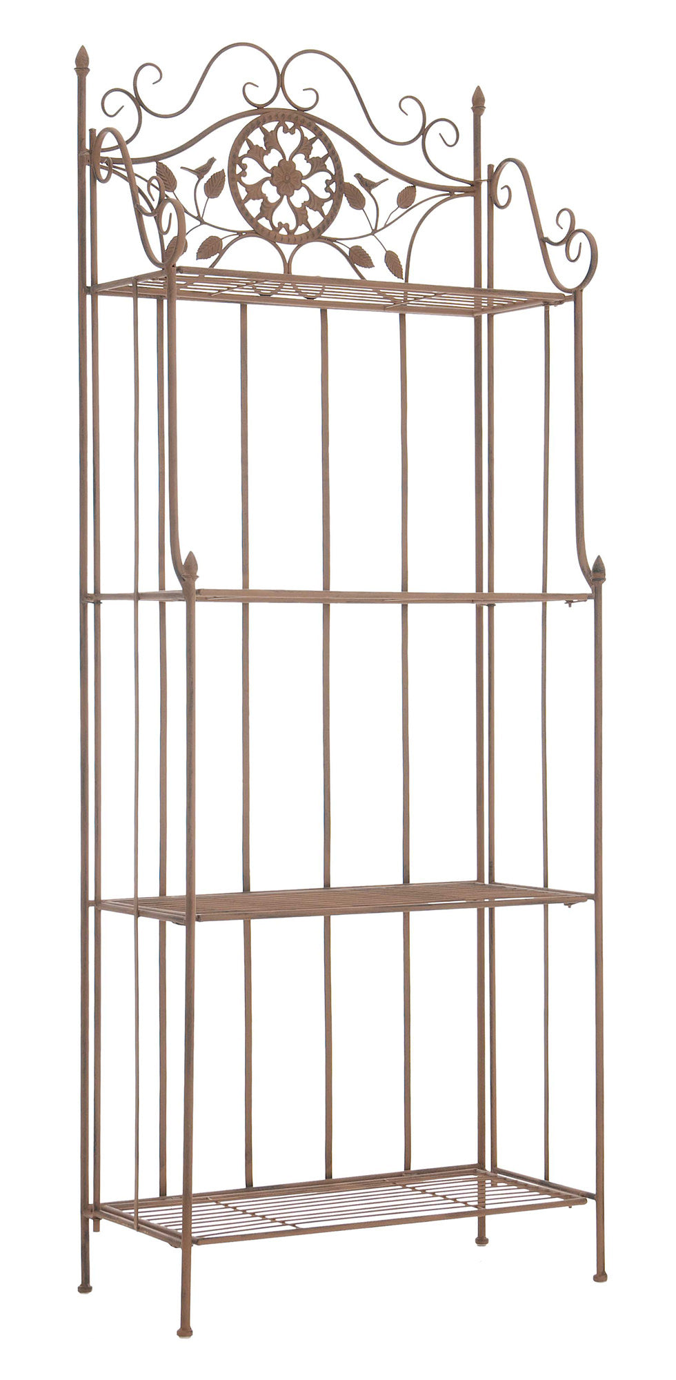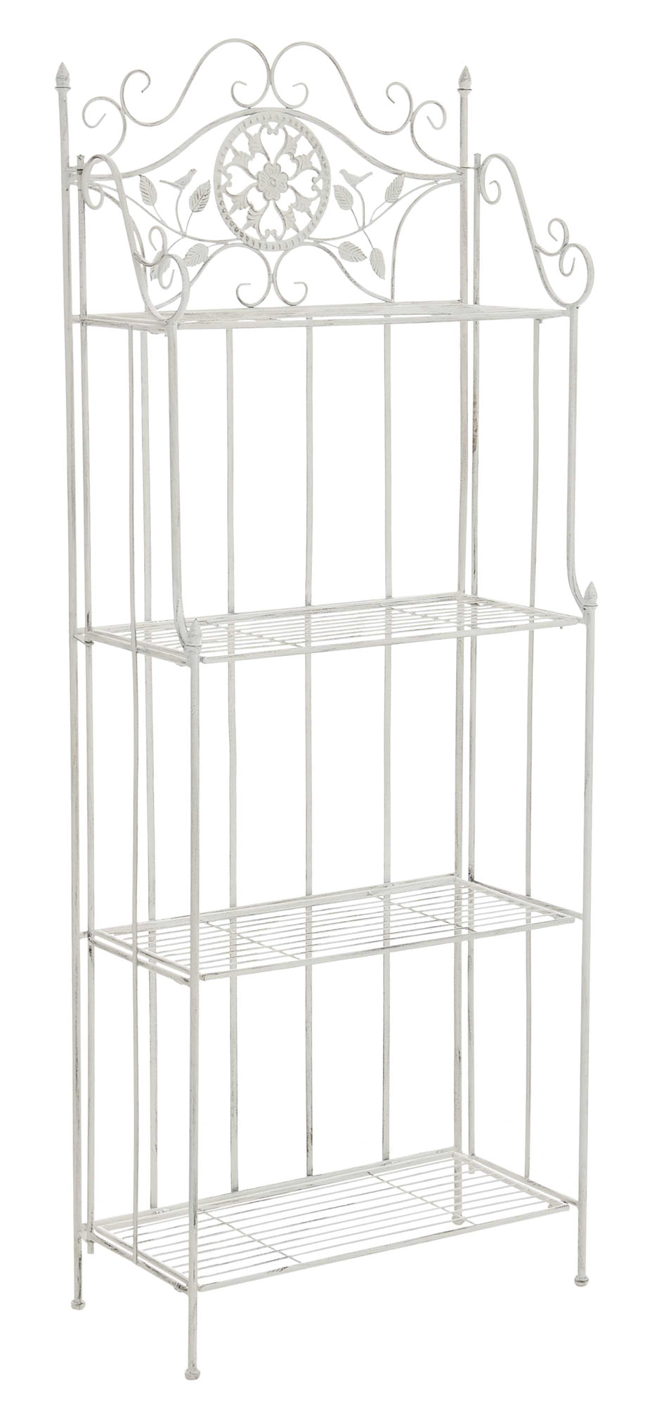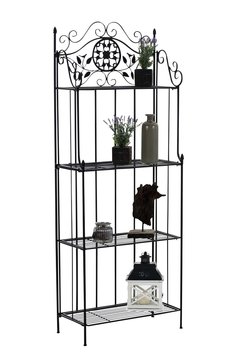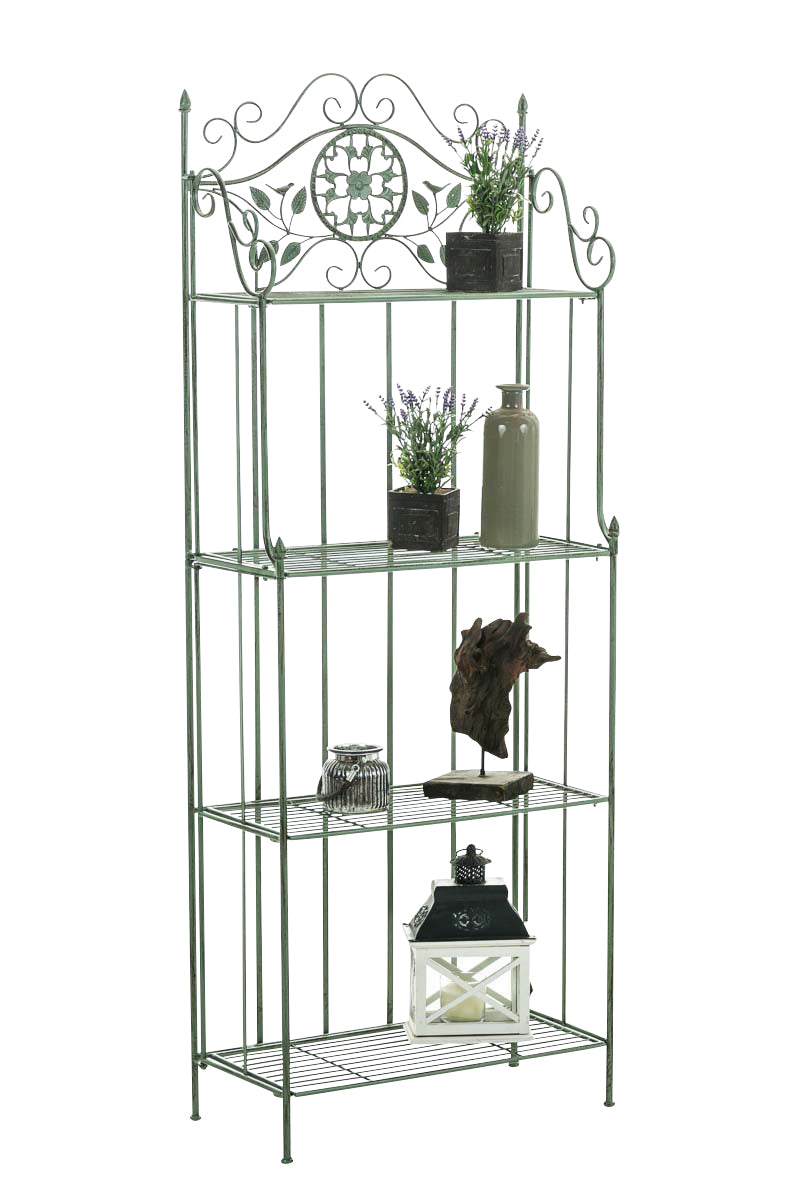 Das Standregal Flora verleiht jedem Raum einen romantischen Look! Dieses filigrane Regal ist mit vielen schmückenden Verzierungen gestaltet und überrascht trotz zarter Erscheinung durch Stabilität und Langlebigkeit. Es besteht dabei aus hochwertigen Eisenrohr, welches zusätzlich pulverbeschichtet ist und es somit zu einen absolut qualitativ hochwertigen Produkt macht. Aber das Regal hat noch mehr zu bieten: Es ist bei Bedarf zusammenklappbar, so kann es leicht verstaut und transportiert werden. Das Produkt ist original verpackt und leicht aufzubauen, ohne Dekoration.