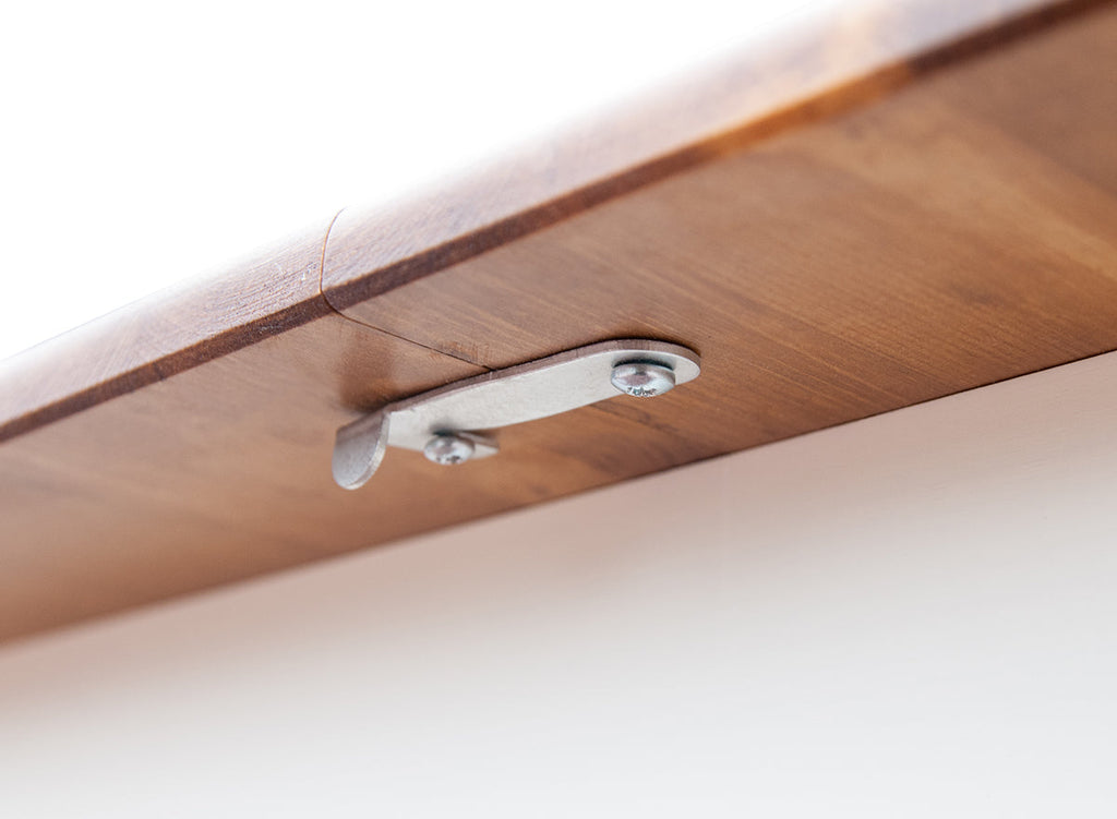 Der praktische Auszugsmechanismus lässt sich mühelos von einer Person bedienen. Beim Ziehen an einer Seite fährt die andere automatisch mit, und eine zusätzliche Einlegeplatte im Inneren verlängert die Tischfläche um fast 50 cm.