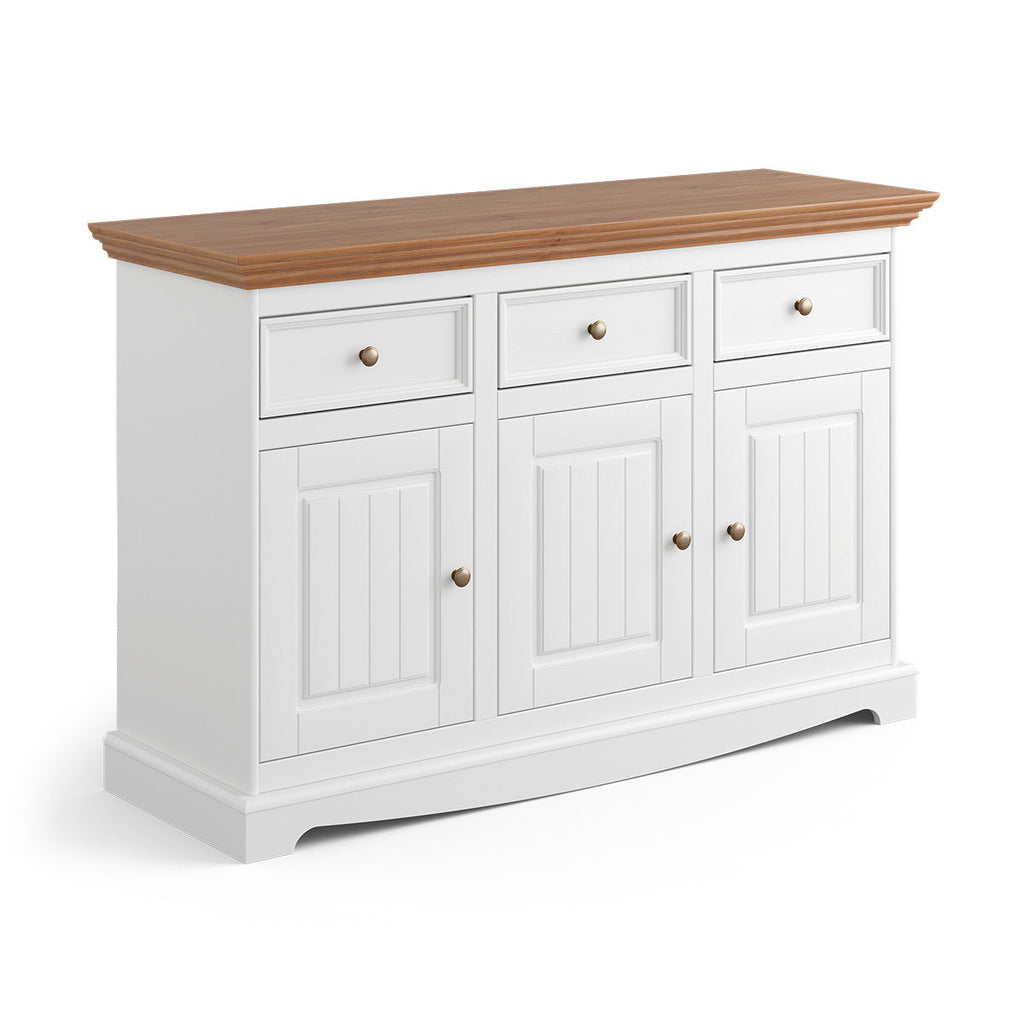 Suchen Sie eine geräumige & stilvolle Kommode mit hochwertiger Verarbeitung & zeitlosem Design? Die Bologna Elegante 3.3 Kommode aus weißem Kiefernholz mit Eichenplatte ist die perfekte Wahl für alle, die Funktionalität, langlebige Qualität & ästhetische Eleganz miteinander verbinden möchten. Dank ihrer klassischen Optik im Provence-Stil fügt sie sich harmonisch in verschiedene Wohnbereiche wie Schlafzimmer, Wohnzimmer, Flur oder Esszimmer ein.