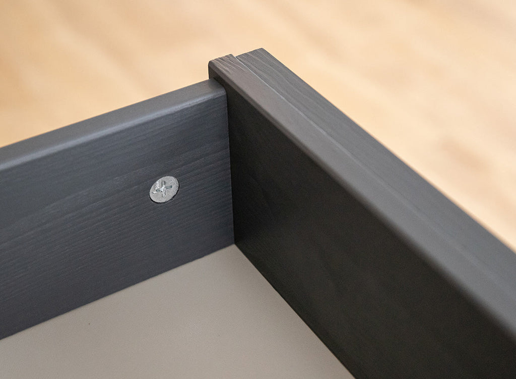 Die schmale Glasvitrine wurde aus massiver finnischer Kiefer gefertigt, einer Holzart, die für ihre Robustheit und Widerstandsfähigkeit bekannt ist. Dank einer sorgfältigen Verarbeitung und ökologischer Lackierung in Graphit (90 % Deckkraft) bleibt die natürliche Maserung des Holzes sichtbar, während die Eichenholzplatte mit Wasserbeize und Lack die Eleganz des Möbels unterstreicht.