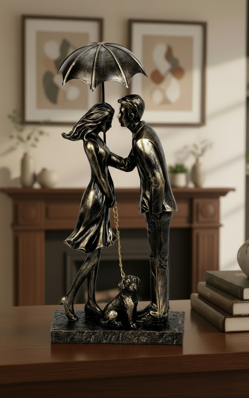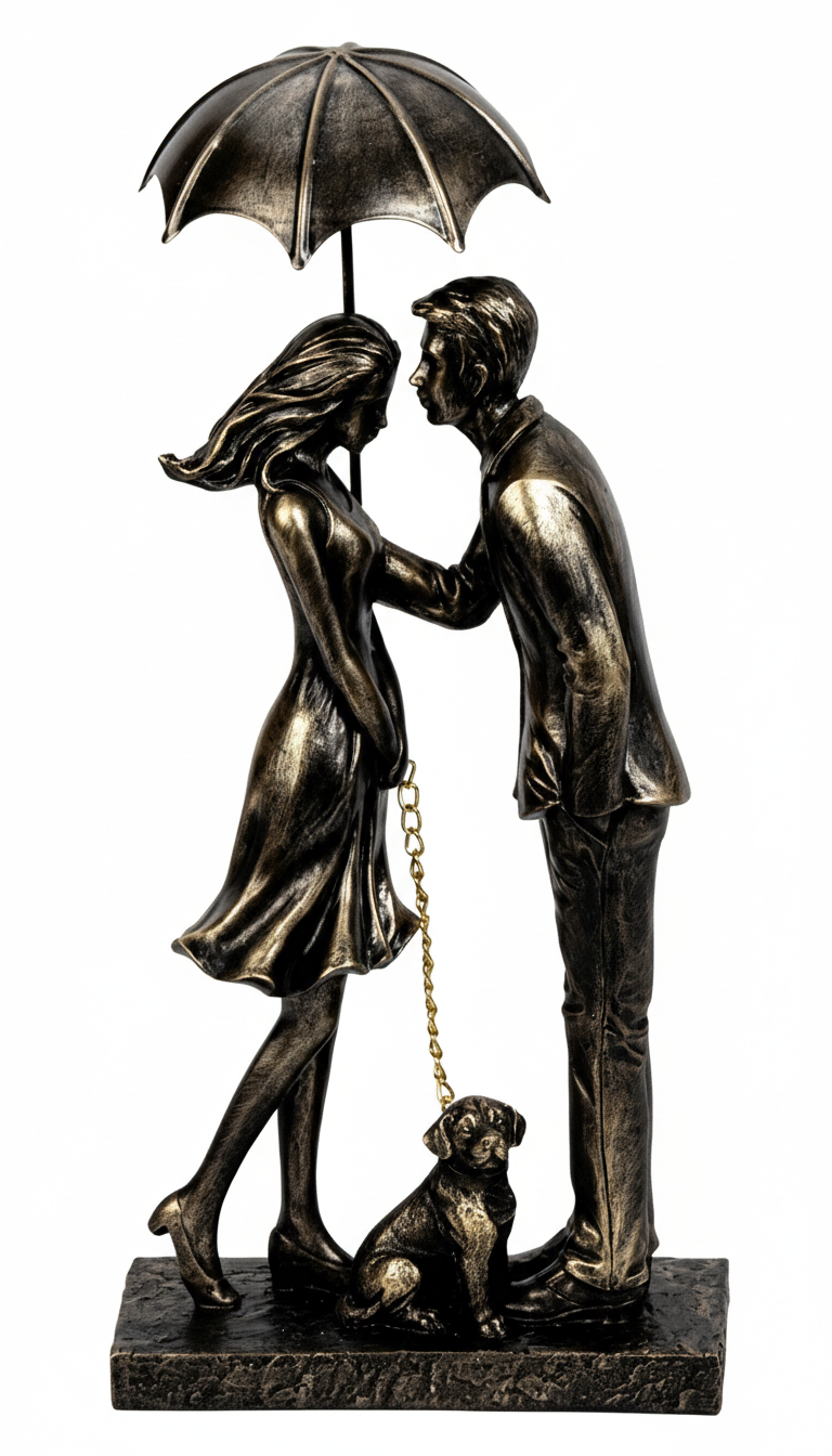 Die stilvolle Dekofigur Paar mit Hund unter Regenschirm verkörpert Liebe, Vertrauen und Geborgenheit auf besonders charmante Weise. Das kunstvoll gestaltete Paar steht eng beieinander unter einem Regenschirm – begleitet von einem treuen Hund, der die Szene auf liebevolle Art abrundet.