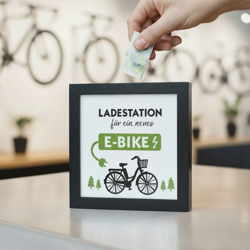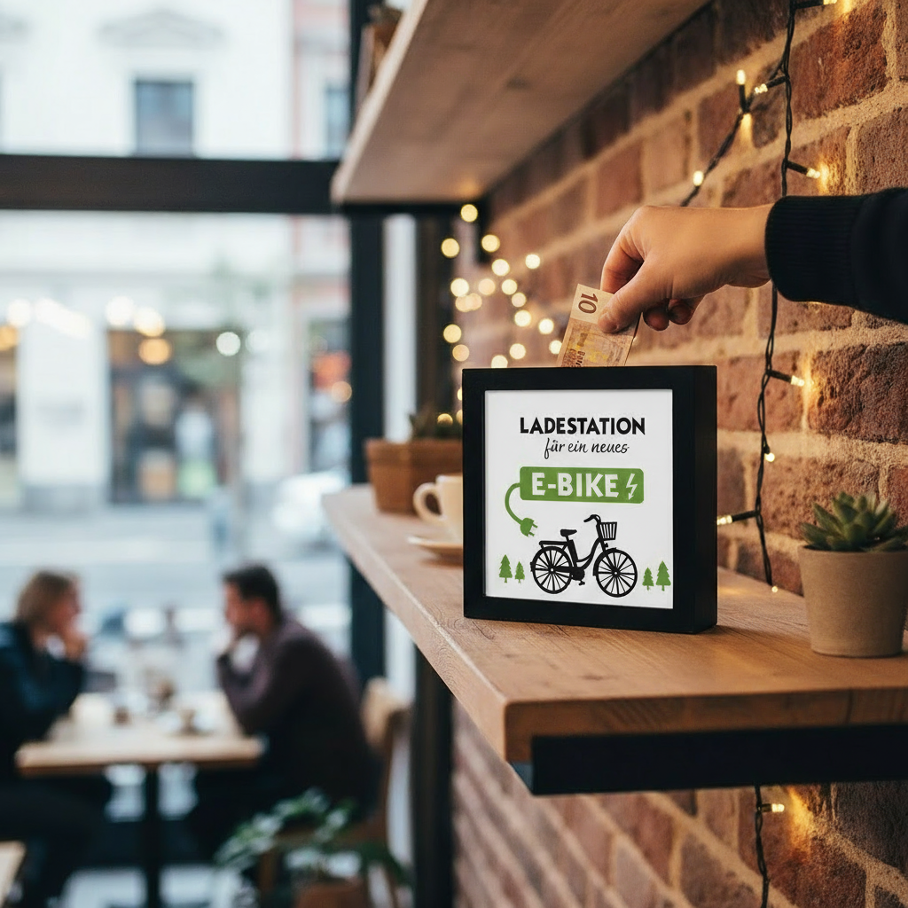 Die Spardose „Fahrradliebe“ ist die perfekte Motivation für alle, die sich den Traum vom eigenen E-Bike erfüllen möchten. Mit dem humorvollen Aufdruck „Ladestation für ein neues E-Bike“ und dem charmanten Fahrradmotiv lädt diese stilvolle Spardose zum Sparen ein – ganz ohne Kabel, aber mit viel Herz. Das quadratische Design aus MDF und Glas in klassischem Schwarz mit weiß-grünen Akzenten passt in jedes Zuhause oder Büro. Ob als Geschenkidee für Fahrradfans oder als origineller Hingucker im Eingangsbereich – diese Spardose bringt Witz und Zielorientierung zusammen.