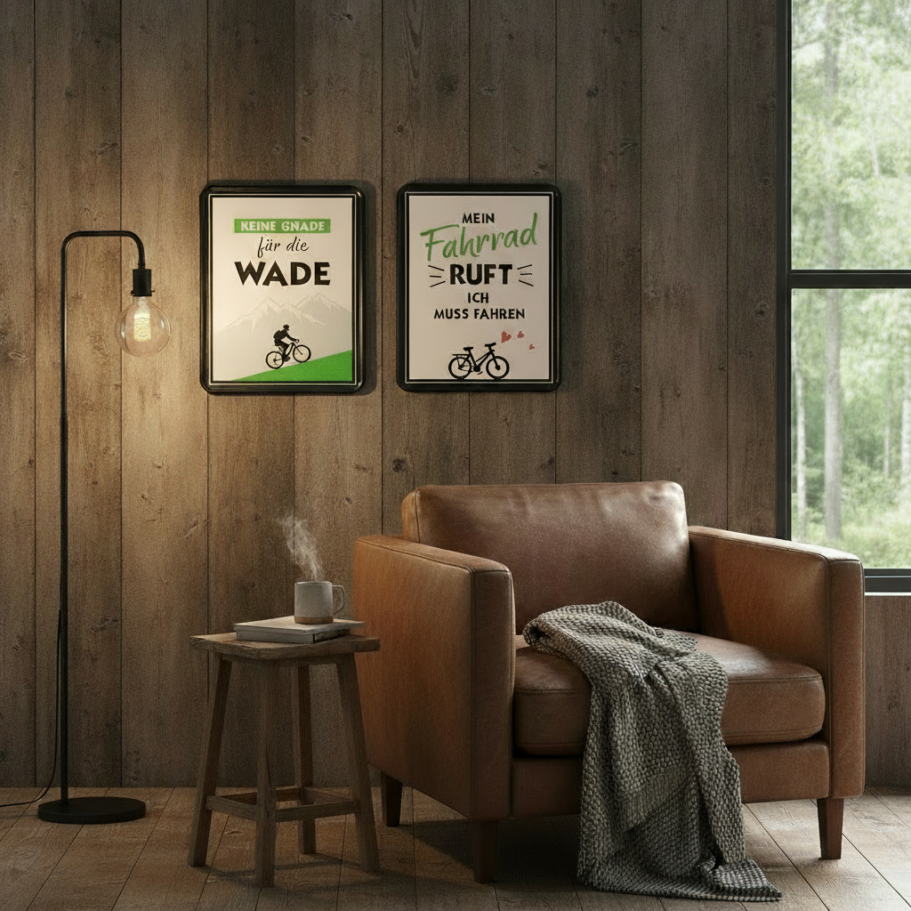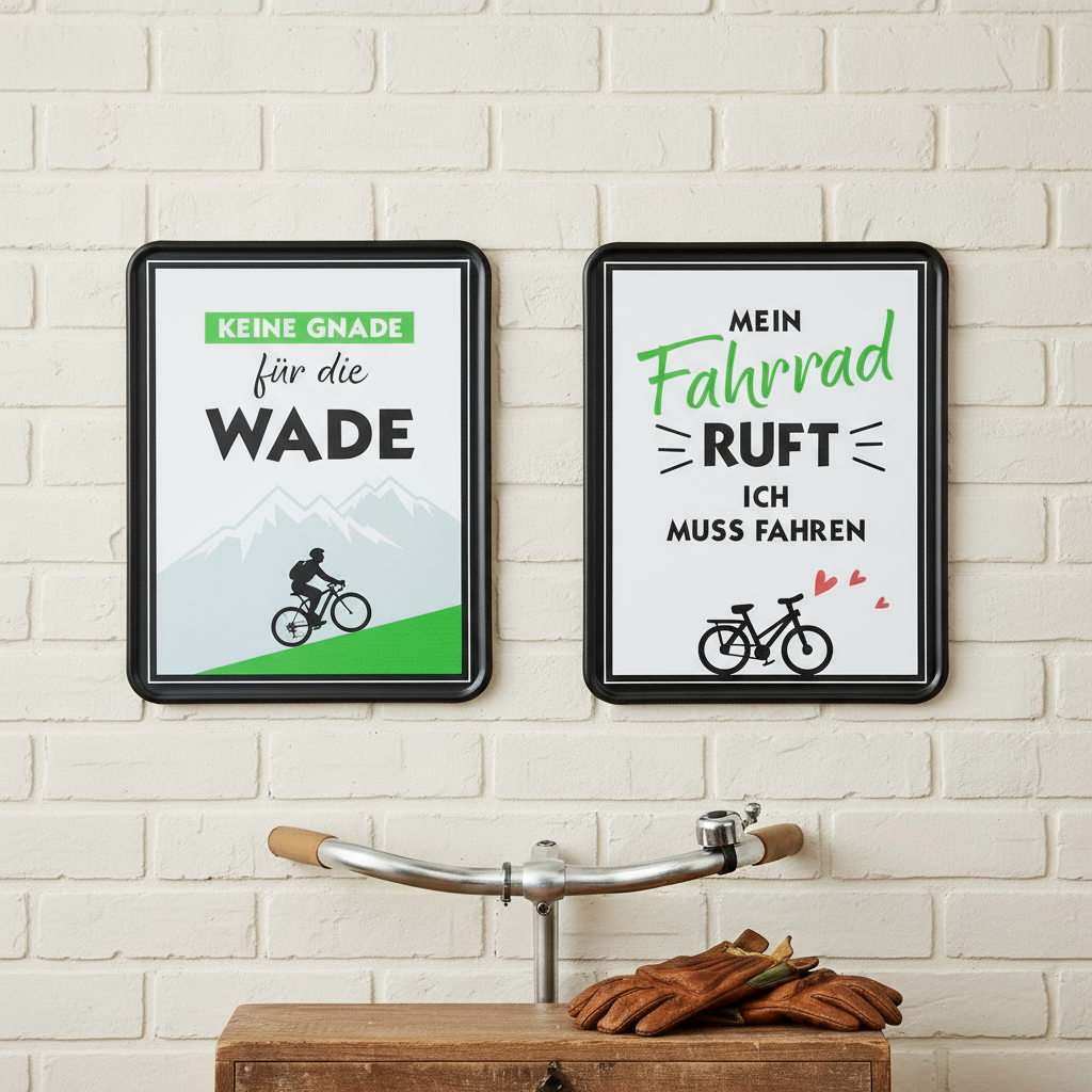 Das Metallschild-Set Fahrradliebe bringt frischen Fahrtwind in jede Einrichtung. Mit ihren charmanten Sprüchen „Mein Fahrrad ruft – ich muss fahren“ und „Keine Gnade für die Wade“ setzen diese beiden rechteckigen Wanddekorationen ein humorvolles Statement für alle Fahrradliebhaber. Die klaren Linien und die kontrastreiche Farbgestaltung in Weiß, Schwarz und Akzentgrün sorgen für einen modernen Look, der sich perfekt in Flur, Wohnzimmer oder Garage integrieren lässt. Dank der robusten Metallausführung sind die Schilder nicht nur stilvoll, sondern auch langlebig – eine Hommage an die Liebe zum Radfahren, die täglich ein Lächeln auf die Lippen zaubert.
