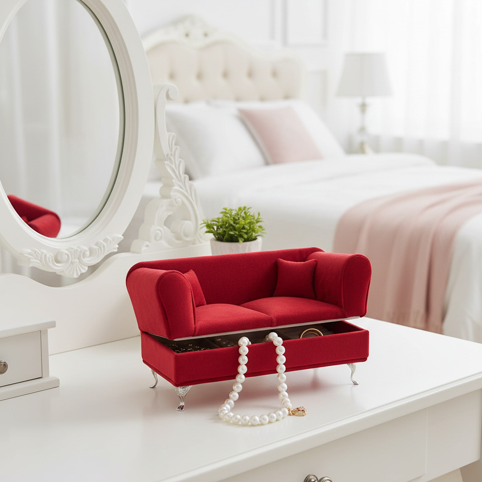 Ein edler Hingucker für Ihre Schmucksammlung – der Schmuckkasten Canape in luxuriösem Dunkelrot. Gefertigt in aufwendiger Handarbeit, überzeugt er mit seiner charmanten Sofaform, die an ein stilvolles Canape erinnert. Die samtige Oberfläche aus hochwertigem Polyester verleiht dem Schmuckkasten eine besonders weiche Haptik und setzt edle Akzente in Ihrem Raum. Die eleganten, geschwungenen Metallfüße runden das Design ab und sorgen für eine stabile Positionierung auf Ihrem Tisch oder Ihrer Kommode. Perfekt geeignet zur stilvollen Aufbewahrung von Schmuckstücken, kleinen Accessoires oder als dekoratives Highlight.