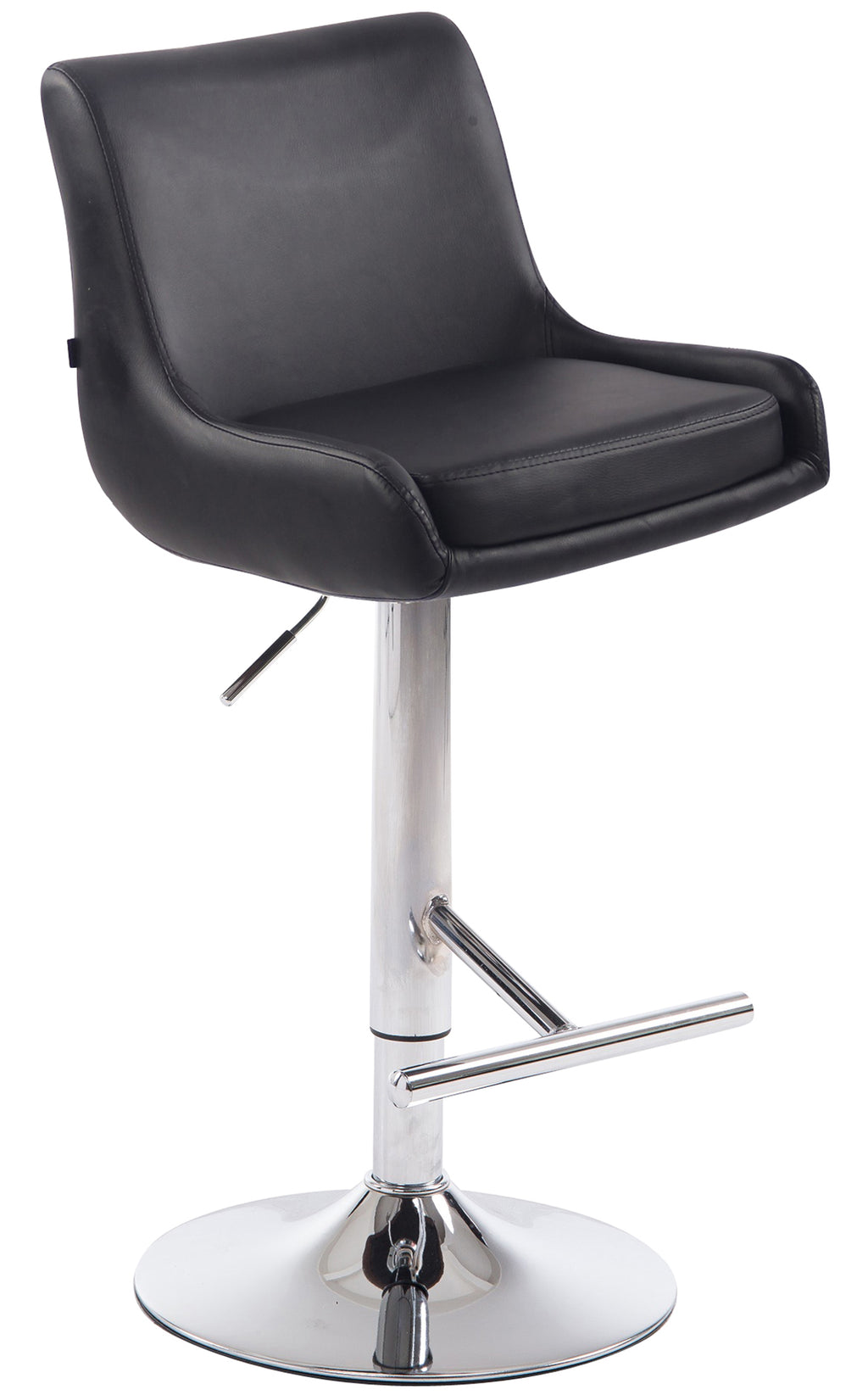 Dieser Hocker besticht durch sein stillvolles Design. Der Sitz ist mit einem pflegeleichten Kunstlederbezug versehen. Mithilfe des Gaslifts lässt sich dieses Modell in der Wunschhöhe stufenlos einstellen, sodass er für jede Thekenhöhe bestens geeignet ist. Die Fußstütze, die einen sehr guten Sitzkomfort gewährleistet, ist synchron mit der Höhe des Sitzes verstellbar. Die Sitzfläche ist mit der Fußablage um 360° drehbar. Das Gestell besteht wahlweise aus Metall in Chromoptik oder schwarzem Metall. Zudem befinden sich unter dem Trompetenfuß Bodenschoner, die ein Verkratzen des Bodens verhindern.