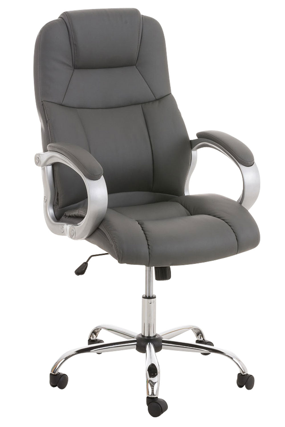 Der Chefsessel Apoll ist ein exklusiver Bürostuhl mit einer sehr hochwertigen Polsterung und Kunstlederbezug. Kunstlederbezüge haben den Vorteil, dass sie elastisch sind und sich bei Entlastung wieder glatt ziehen. Dies sieht nicht nur schöner aus, sondern erhöht zusätzlich die Lebensdauer des Sitzbezuges. Das Gestell ist aus Metall in Chromoptik und dadurch sehr stabil. Dank der verstellbaren Sitzhöhe ist ergonomisches Sitzen garantiert. Die Sitzhöhe ist mit dem Hebel unter dem Sitz stufenlos verstellbar. Der eingebaute Wippmechanismus sorgt für mehr Bewegungsfreiheit. Der Bürostuhl steht standsicher auf fünf Leichtlaufrollen. Egal ob Hart- oder Teppichböden - Sie werden immer leicht und locker über den Boden rollen können.