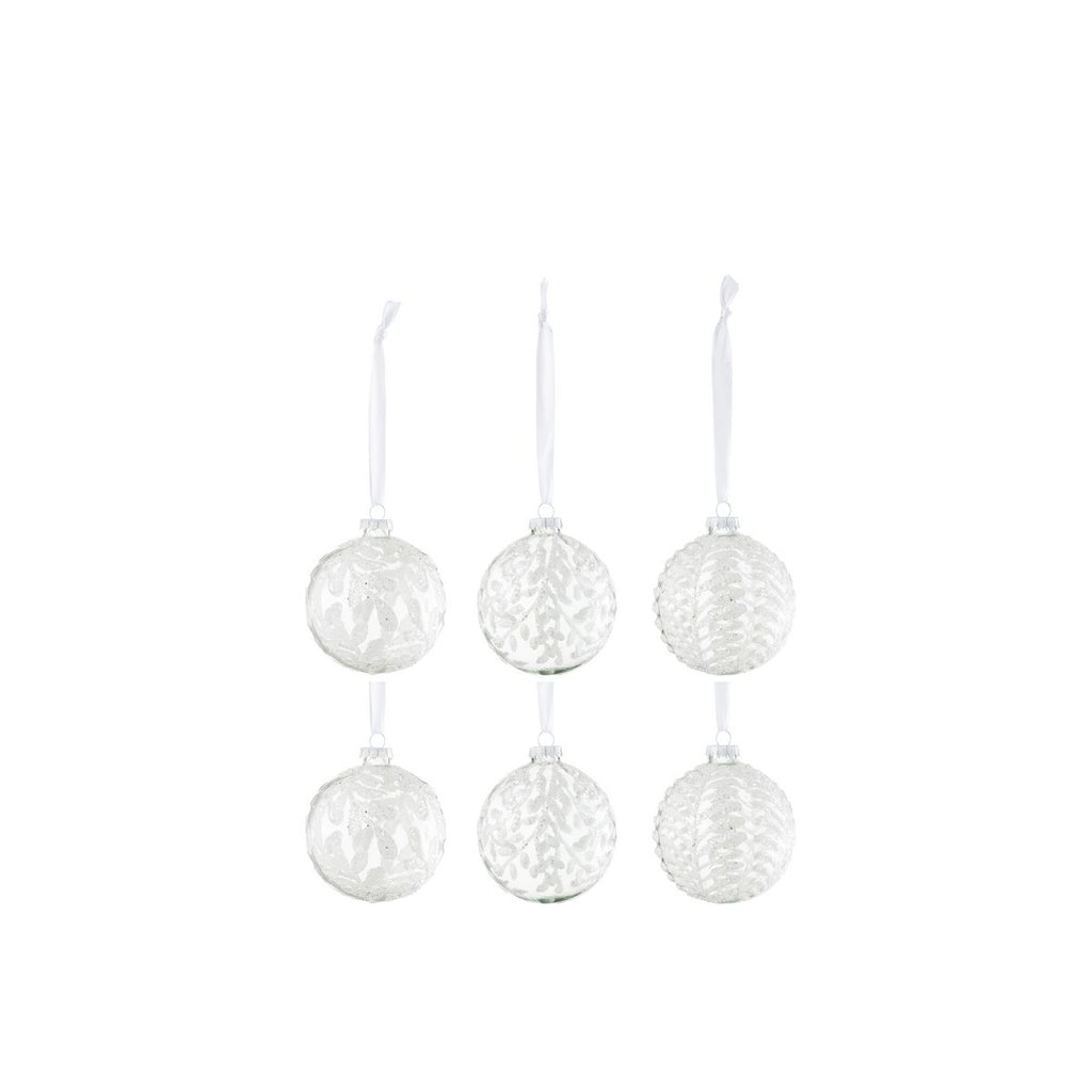 J-Line Box mit 6 Weihnachtskugeln, 2+2+2 Blätter, Pailletten, Glas, Weiß, klein