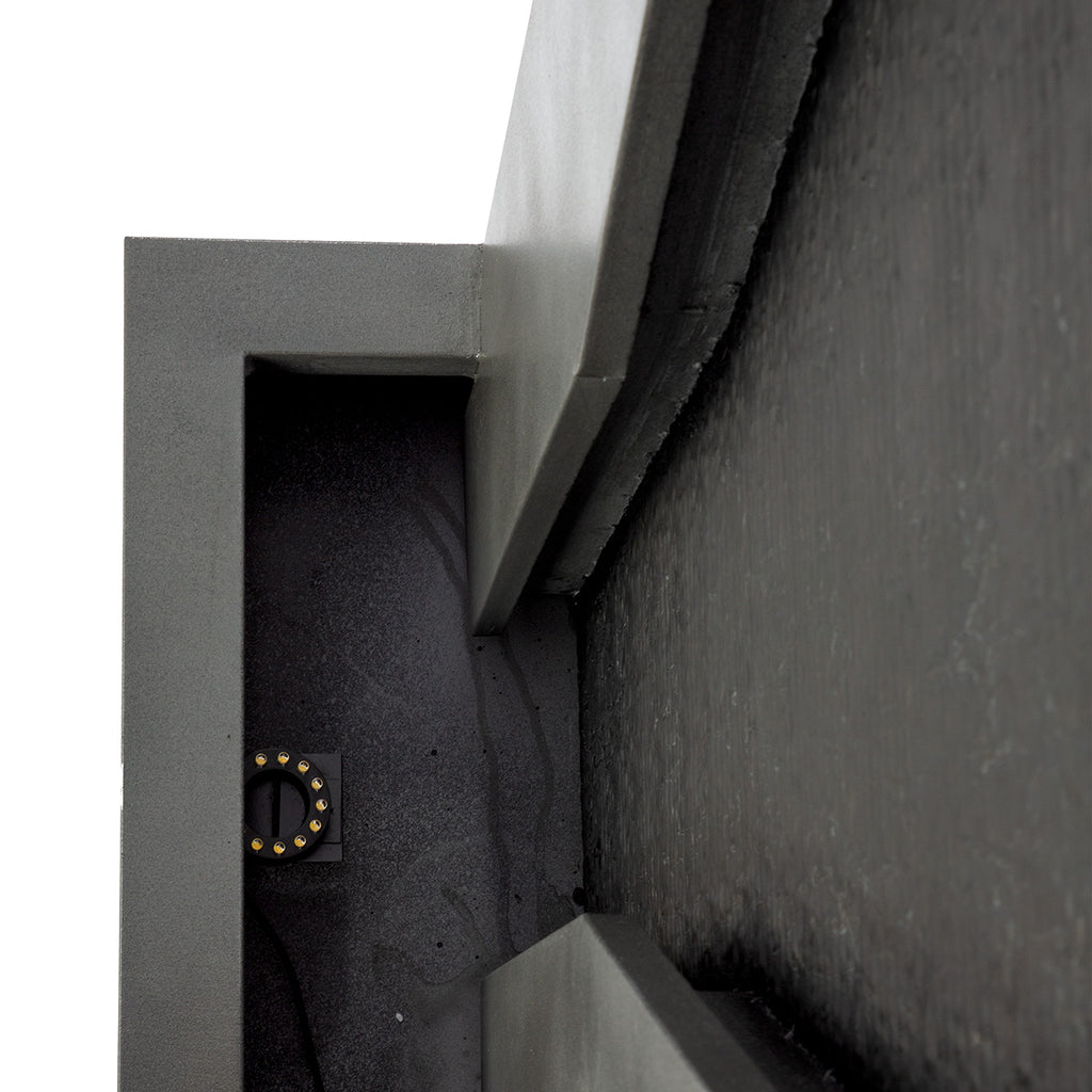 Das fließende Wasser gleitet sanft über die strukturierte Oberfläche und wird dabei von einer integrierten LED-Beleuchtung wirkungsvoll in Szene gesetzt. Diese erzeugt bei Dämmerung ein atmosphärisches Lichtspiel und sorgt für eine ruhige, entspannende Stimmung.