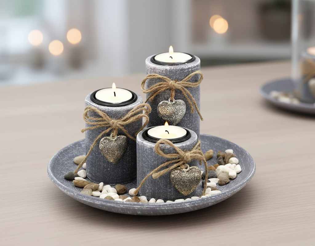 Das Teelichthalter-Set Livia bringt harmonische Eleganz und eine warme Atmosphäre in jeden Wohnbereich. Auf einem runden Dekoteller in grauer Vintage-Optik präsentieren sich drei unterschiedlich hohe Teelichthalter, liebevoll verziert mit rustikalem Juteband und detailreichen Herzanhängern in antiksilberner Ausführung. Umrahmt wird das Ensemble von dekorativen Natursteinen, die dem Arrangement einen natürlichen, ausgewogenen Charakter verleihen. Ob auf dem Wohnzimmertisch, im Eingangsbereich oder als stilvolle Tischdekoration – Livia zieht mit ihrem charmanten Design alle Blicke auf sich und sorgt für stimmungsvolle Lichtakzente. Ideal für gemütliche Abende, romantische Dekorationen oder als liebevolles Geschenk für besondere Anlässe.