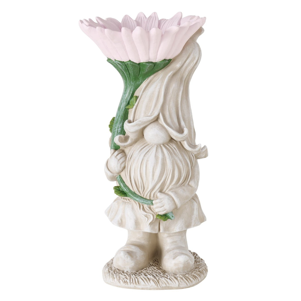 Die fein ausgearbeiteten Details wie der strukturierte Bart, die geschwungene Mütze in Blütenform sowie die naturnahe Gestaltung des Standfußes unterstreichen die hochwertige Verarbeitung. Durch die matte Oberflächenveredelung wirkt die Figur besonders edel und fügt sich stilvoll in verschiedene Gartenkonzepte ein – ob modern, romantisch oder klassisch.