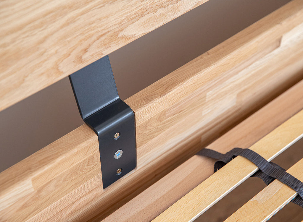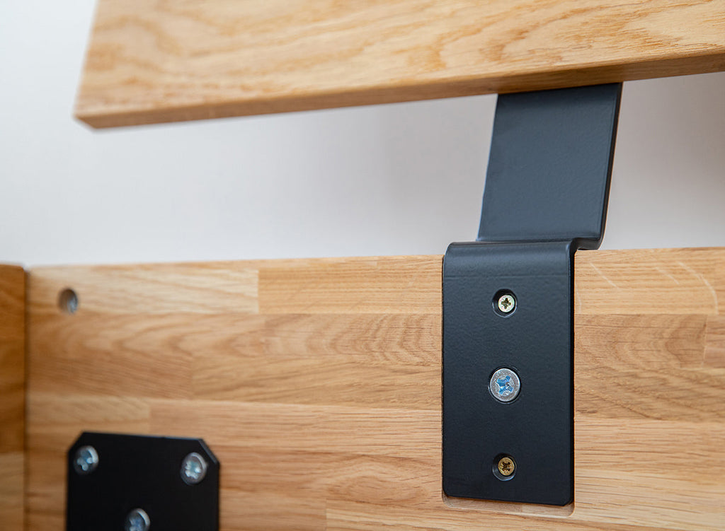 Hinweise auf industrielle Innenräume erfreuen sich seit einigen Jahren ungebrochener Beliebtheit. Das Holzbett aus der Turin-Kollektion passt dank der schwarzen Metallelemente perfekt in diesen Stil. Übermäßige Strenge und Minimalismus der Loft-Anordnung brechen die natürliche Wärme und den Charme von Massivholz perfekt. Ein Eichenbett mit Holzbeinen macht auch in einem skandinavischen oder modernen Interieur eine gute Figur.