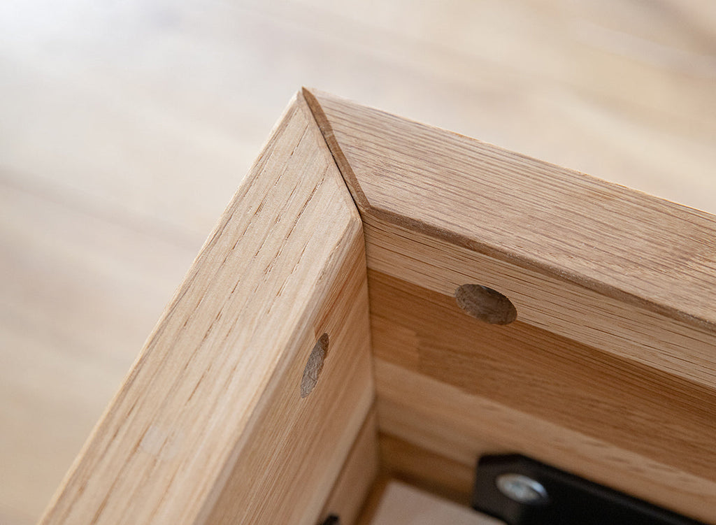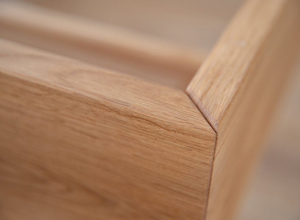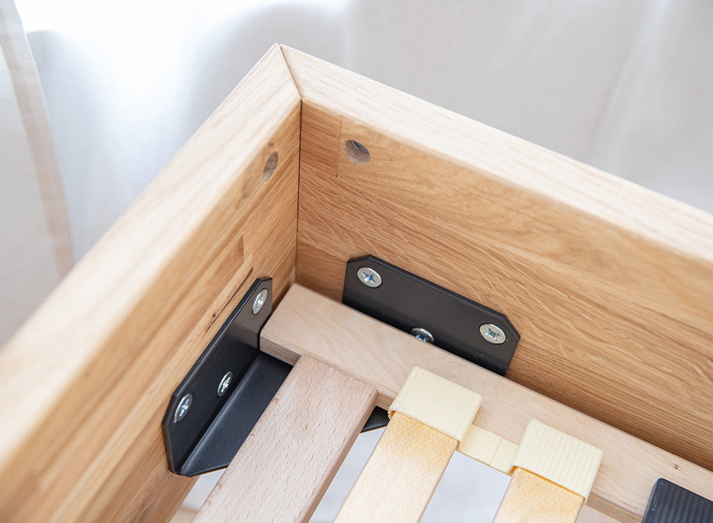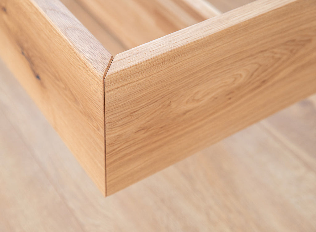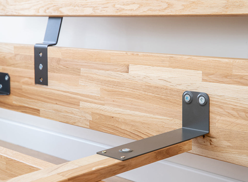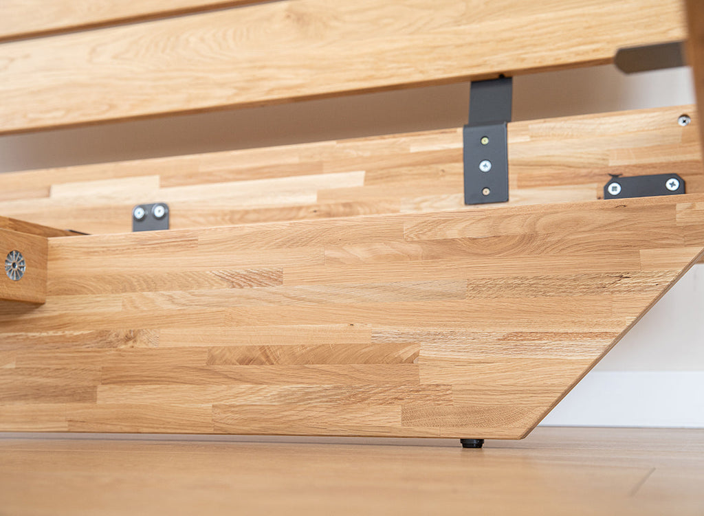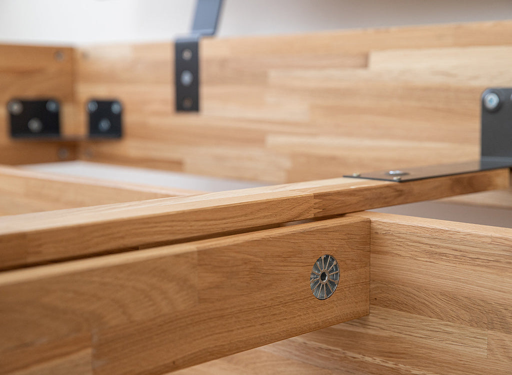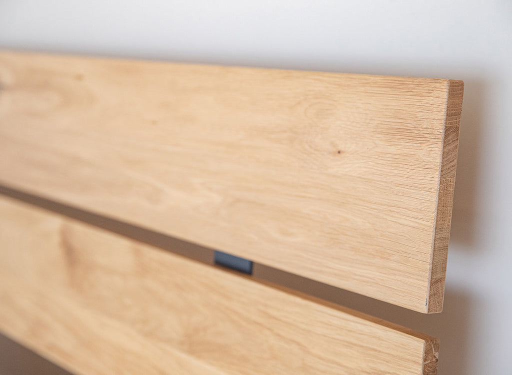 Möbel aus massiver Eiche stehen für Langlebigkeit und Widerstandsfähigkeit gegen alle Arten von Beschädigungen: Verformung, Abrieb, Alterungsprozess. Der größte Teil des Turin-Bettes – das Kopfteil und der Rahmen mit Halterungen – besteht aus Eichenholz, das einen angenehmen, warmen Farbton hat. Eichenholz wird mit der Zeit edler – es erhält eine tiefe, elegante Farbe, die oft noch besser aussieht als am Tag des Kaufs!