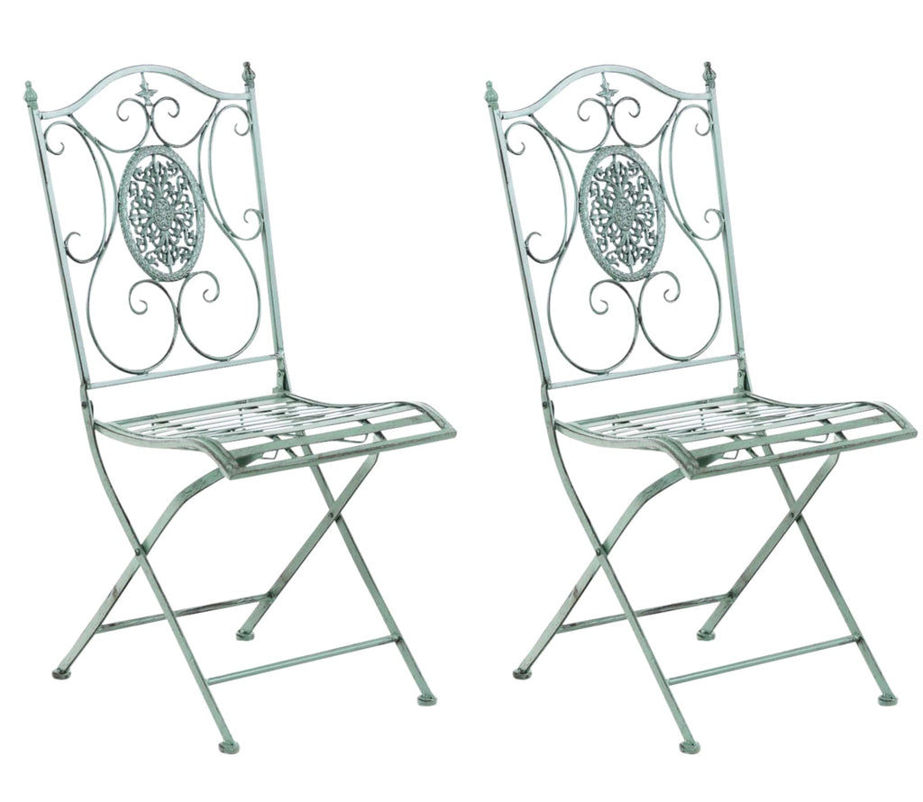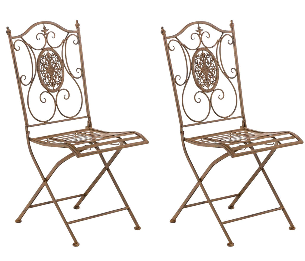 Indien nodig kunnen de ijzeren stoelen eenvoudig worden ingeklapt en opgeborgen om ruimte te besparen. Het product is gemaakt van ijzer, waardoor het extreem stevig is. Het oppervlak is afgewerkt met een handgemaakte antieke patina.