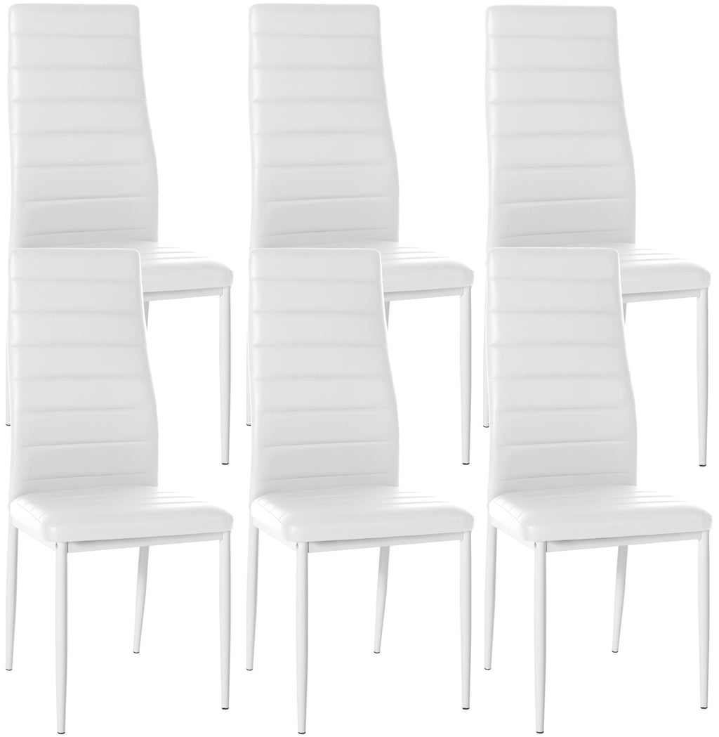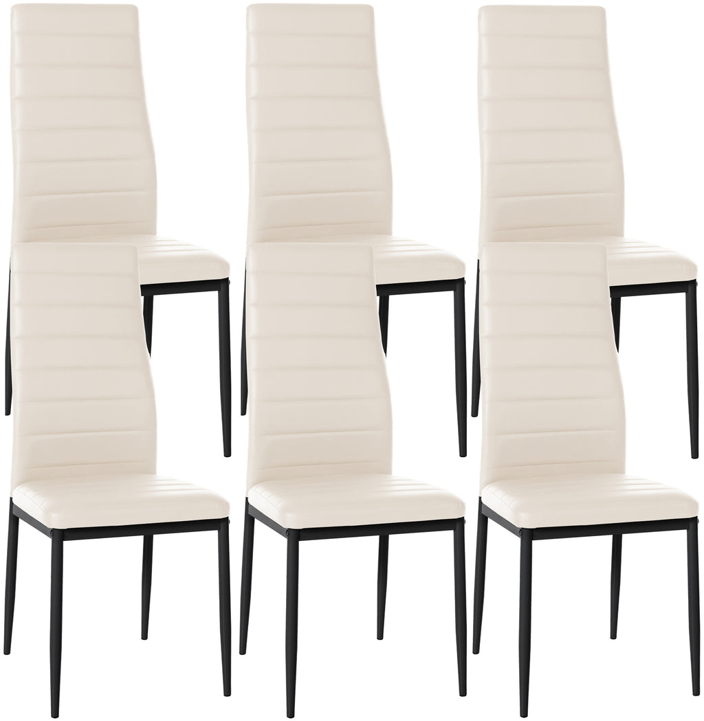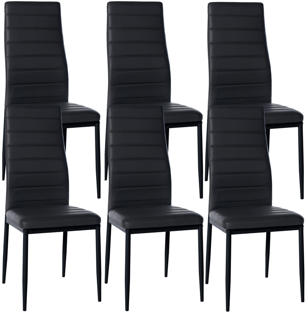 De set van 6 Mayfair eetkamerstoelen met fluwelen bekleding of kunstleren bekleding verrijkt moderne kamers perfect en trekt de aandacht in elke kamer. Door de hoge rugleuning en de prettige en comfortabele vulling kun je ook voor langere tijd comfortabel zitten. Deze fauteuil staat stabiel en stabiel op een vierpoots metalen frame. Voorzien van vloerbeschermers onder de voeten worden krassen en beschadigingen aan de vloer voorkomen. Bovendien is de eetkamerstoel dankzij de onderhoudsvriendelijke materialen op elk moment snel en eenvoudig schoon te maken.