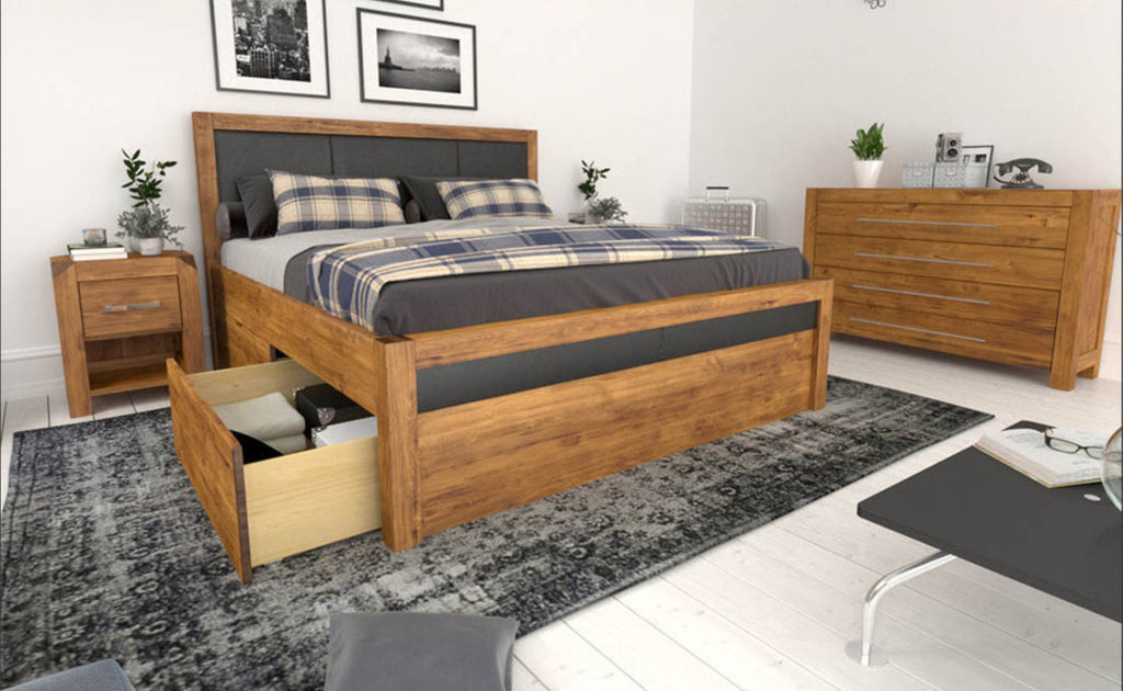 1 x Bettrahmen mit Kopf und Fußteil, 4x Schubladen, 1 x Mittelplanke (ab einer Matratzenbreite von 120cm).